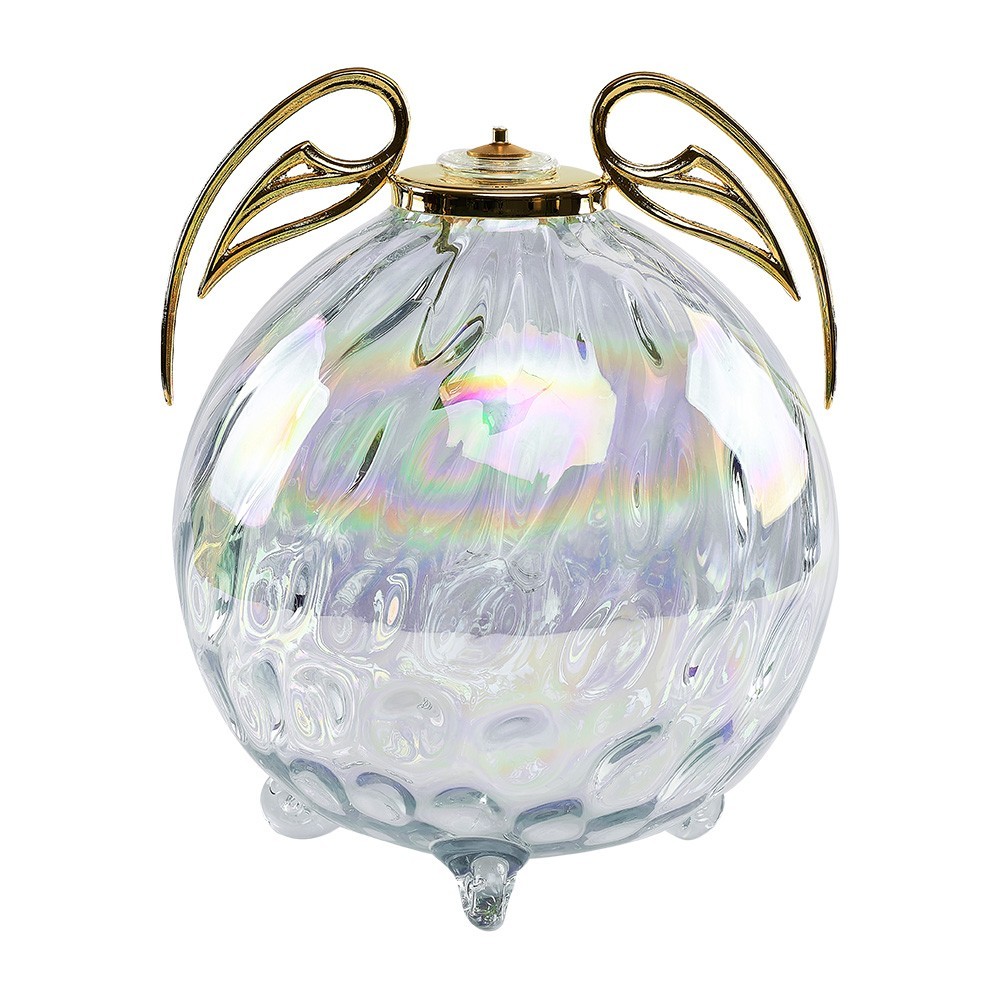 Lampada in cristallo con all'interno cartucca a cera liquida. La lampda è dotata di tre piedini in cristallo d'appoggio e sostenuta da due ali coreografiche.