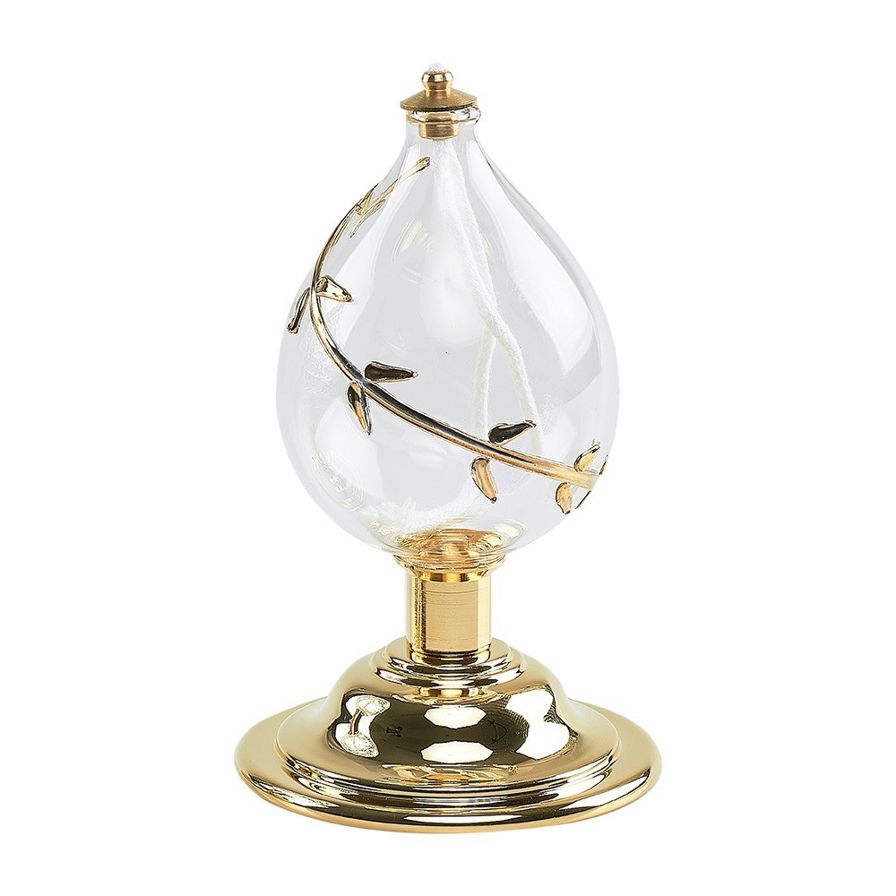 Lume a cera liquida a fomra di goccia in cristallo soffiato con decori in oro. La base è in ottone dorato. Viene fornito completo di stoppino e gigler.