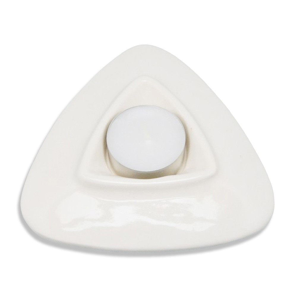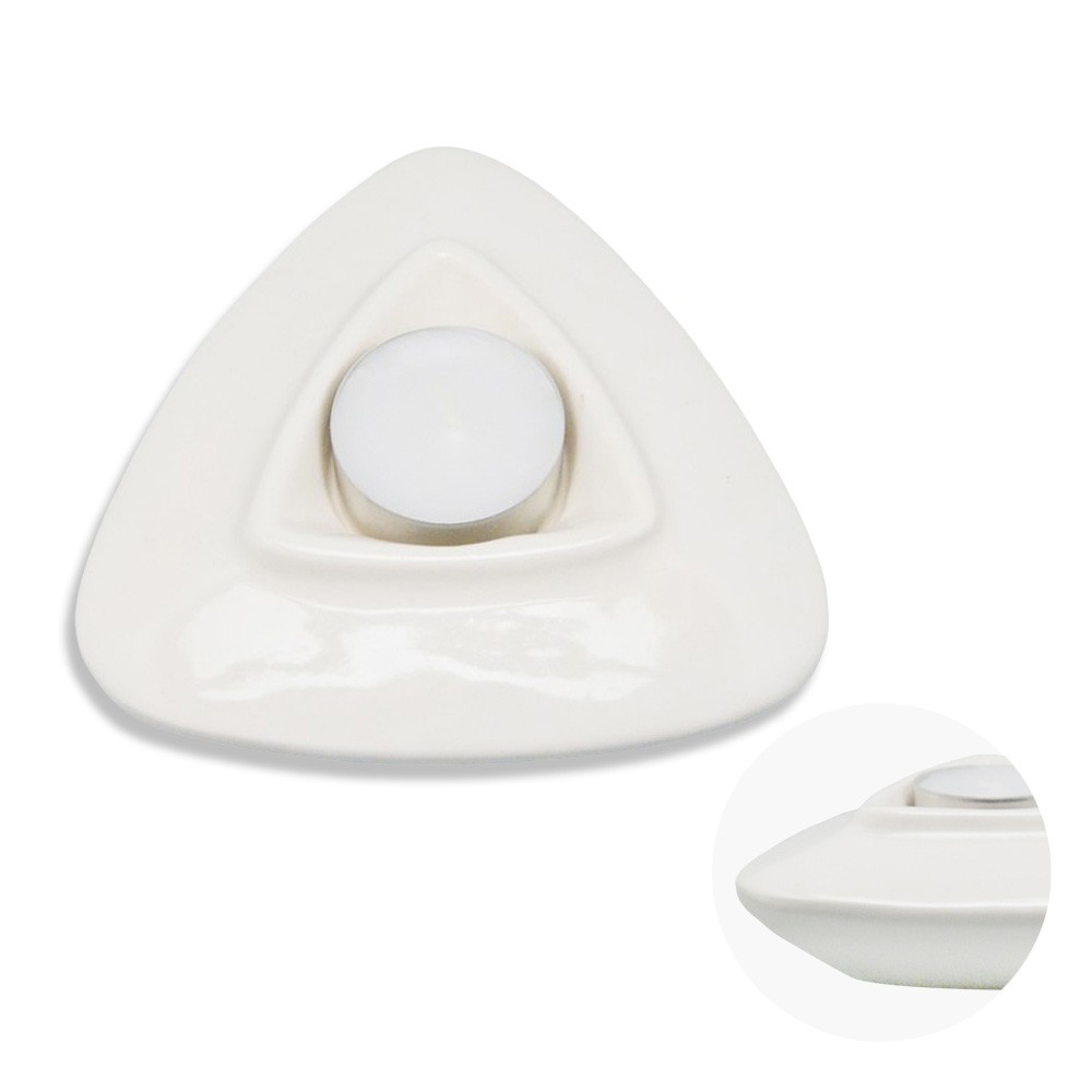 Lampada triangolare portalumino realizzata in ceramica bianca. Completa di lumino in cera.