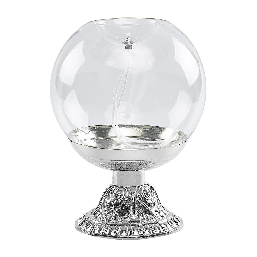 Lampada a cera liquida a forma di sfera in vetro trasparente, realizzata con base in ottone argentato. Viene fornita completa di stoppino e gigler.
