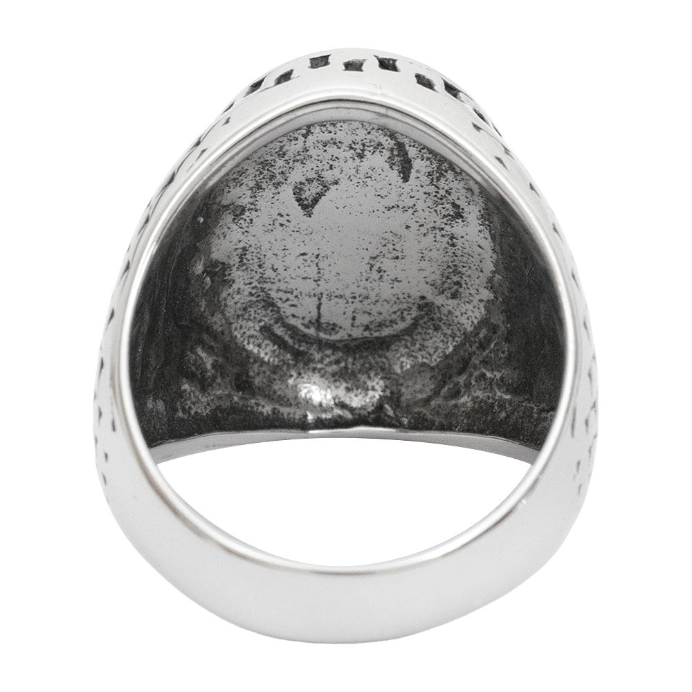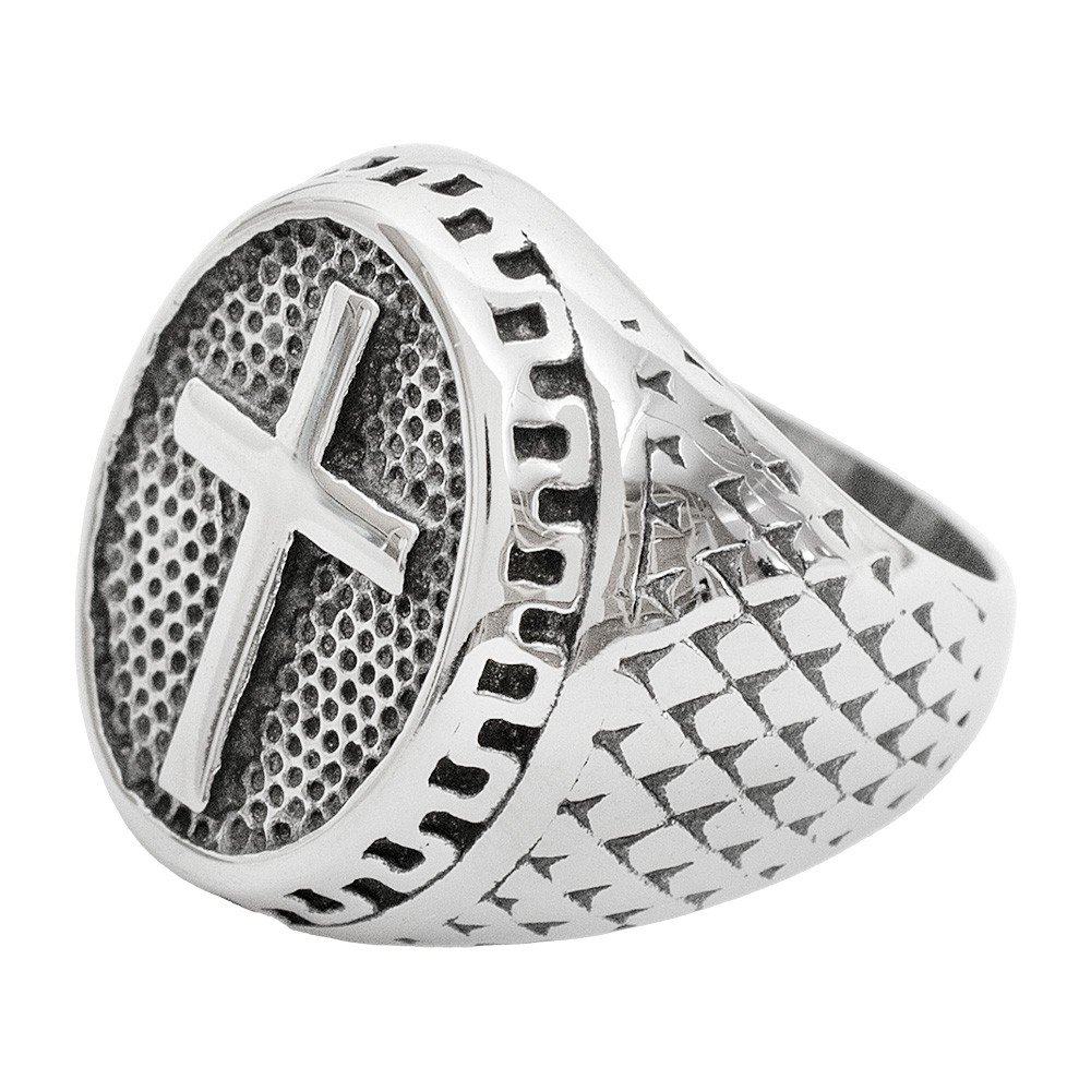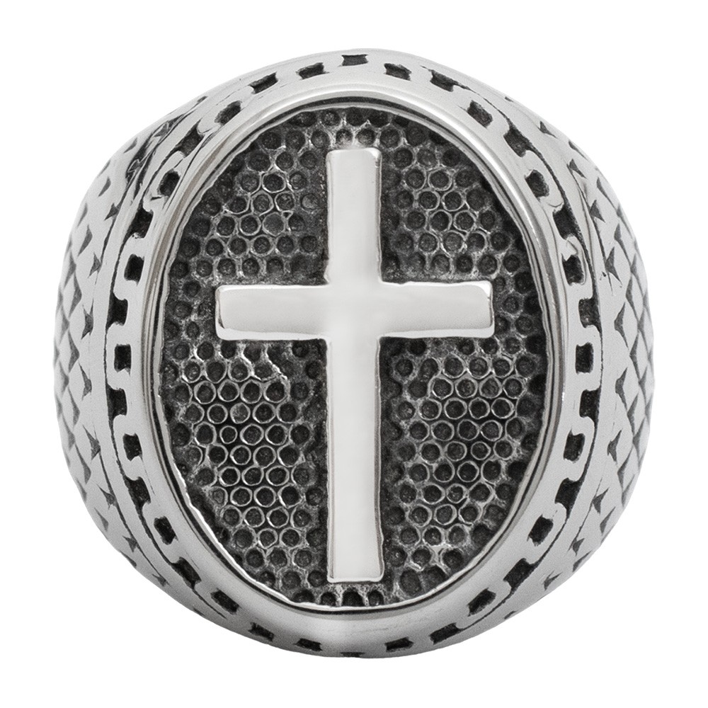 Anello in acciaio da uomo, realizzato a forma ovale con croce latina.
