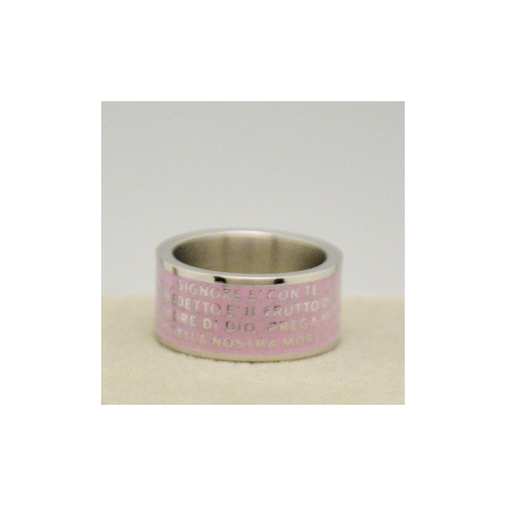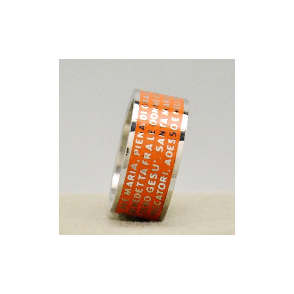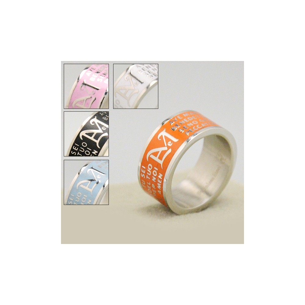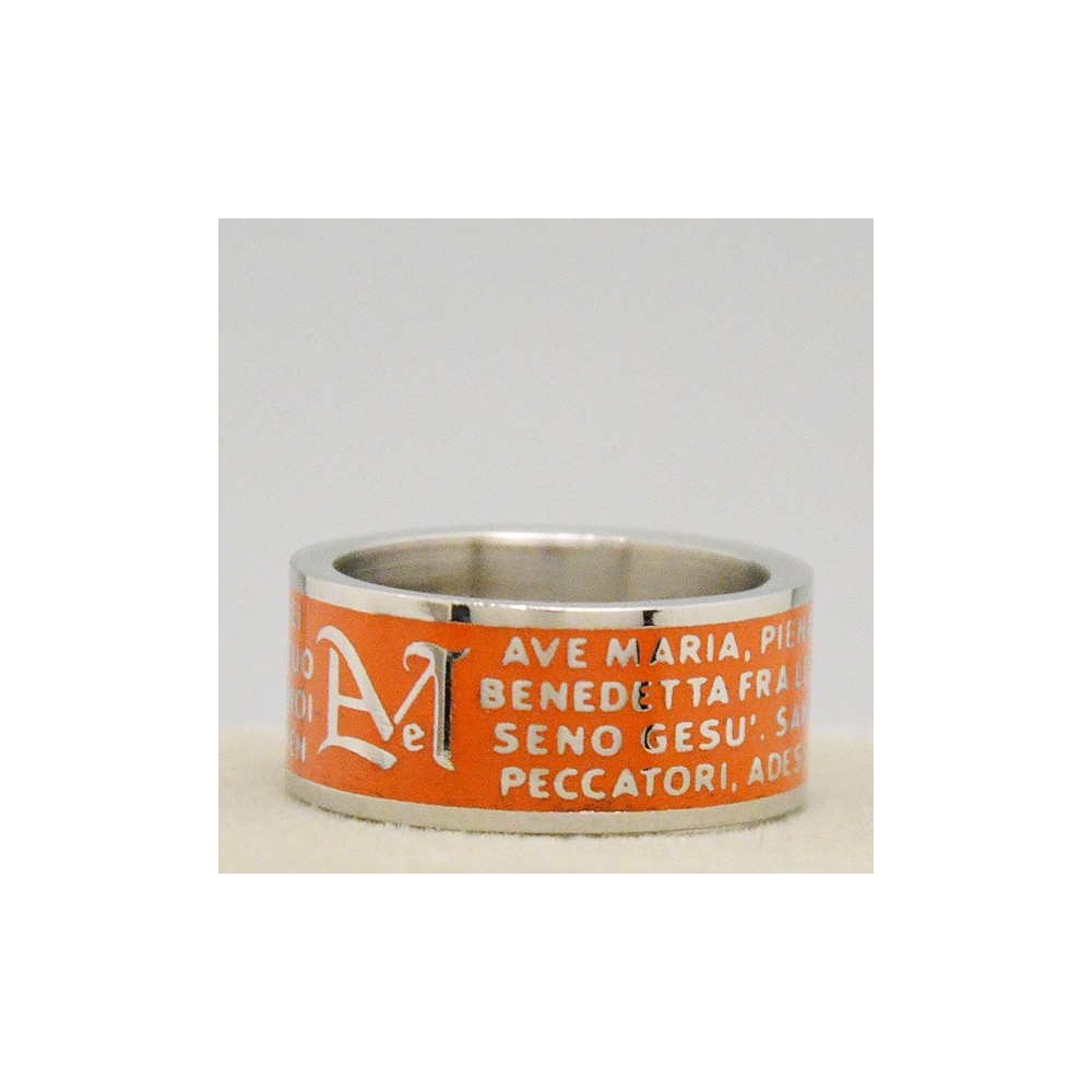 Anello colorato in acciaio INOX lucido e anallergico, adornato da radiosi smalti colorarti con incisa la preghiera dell' Ave Maria. Molto resistente all'acqua e non contiene nikel.