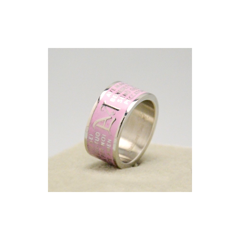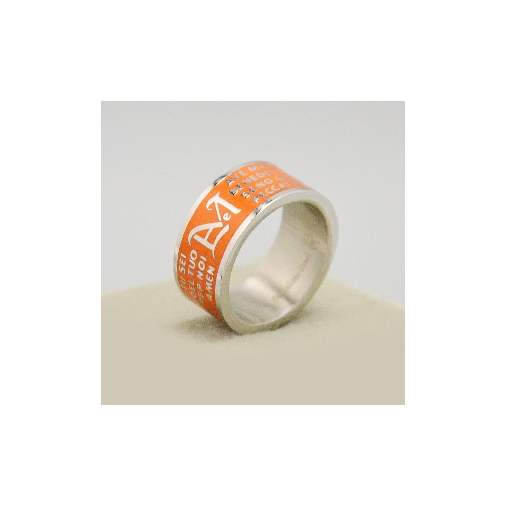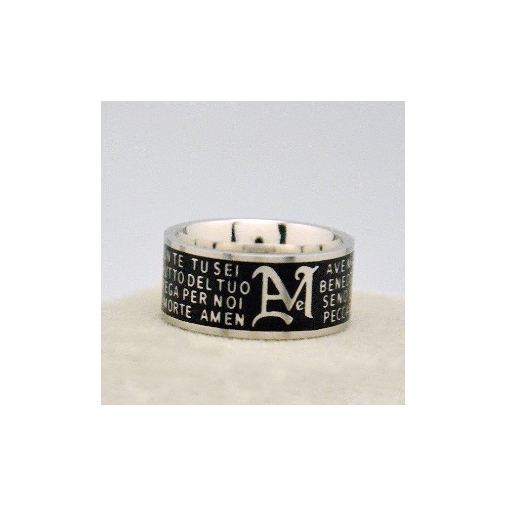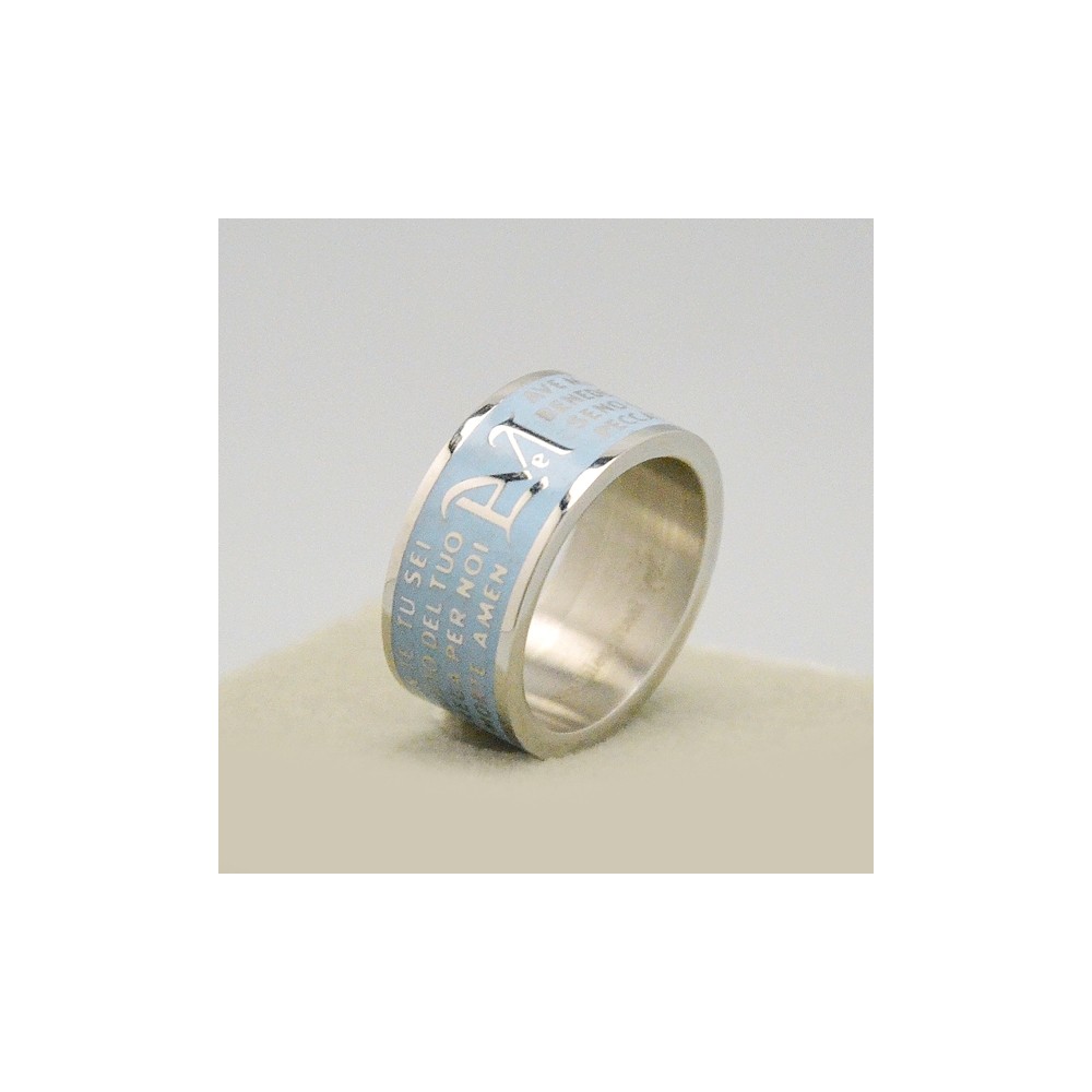 Anello colorato in acciaio INOX lucido e anallergico, adornato da radiosi smalti colorarti con incisa la preghiera dell' Ave Maria. Molto resistente all'acqua e non contiene nikel.