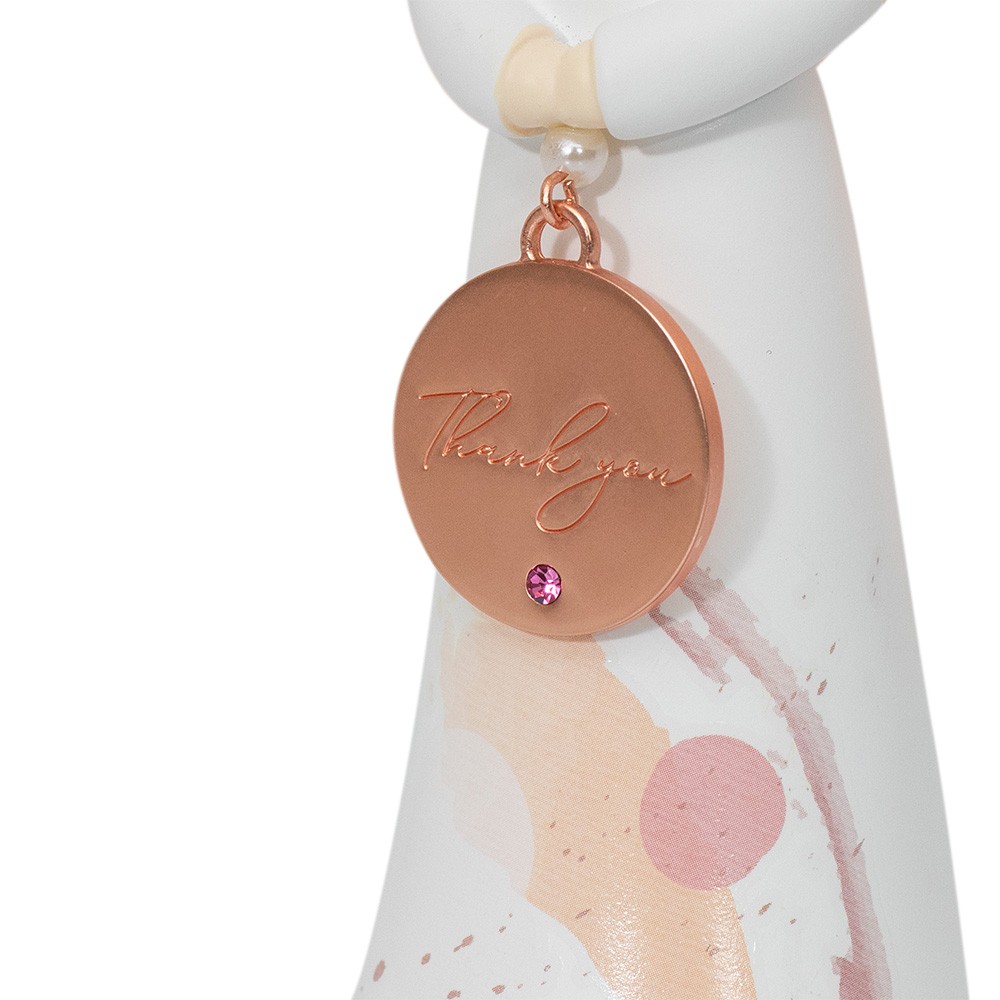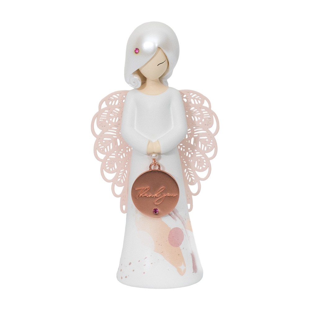 Meravigliosa scultura in resina dipinta a mano, con ali traforate in metallo rosè e pendente tondo con scritta " THANK YOU "