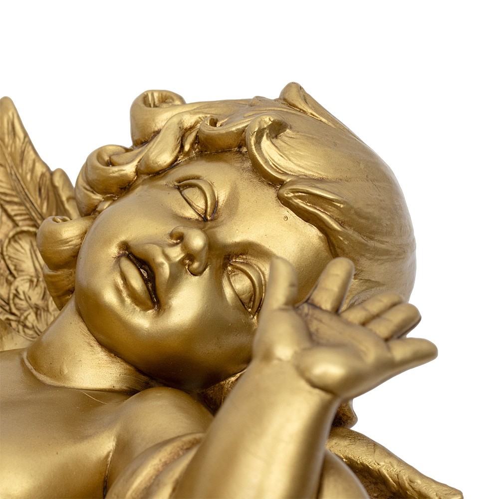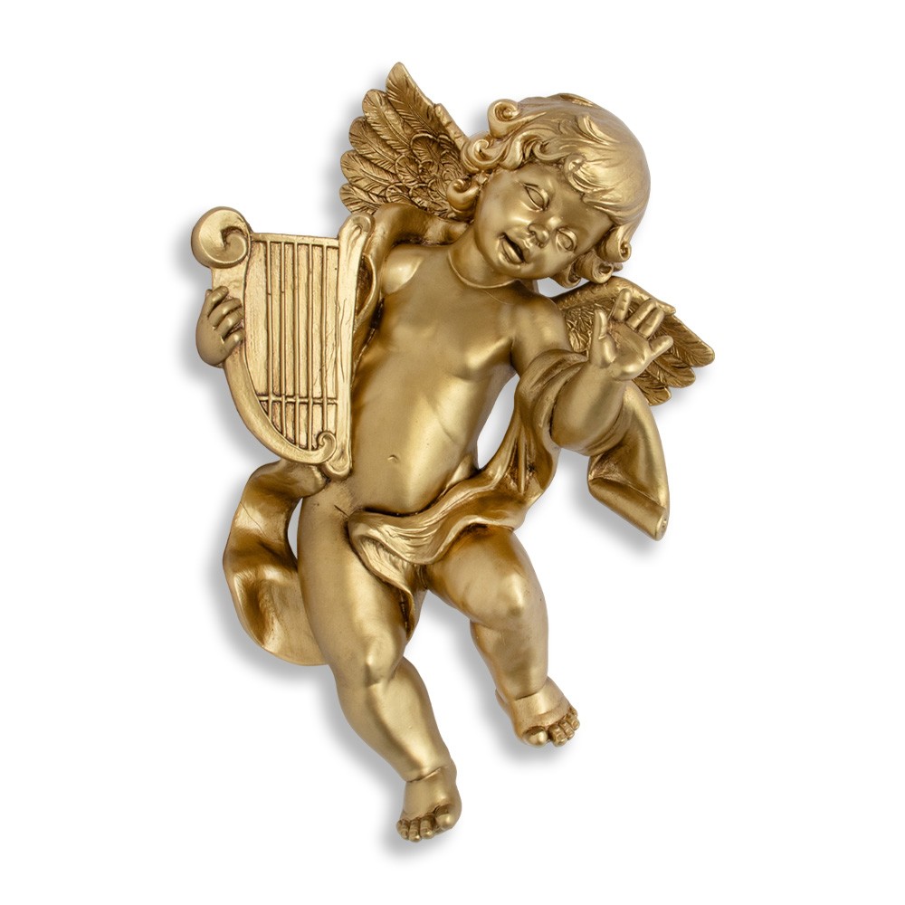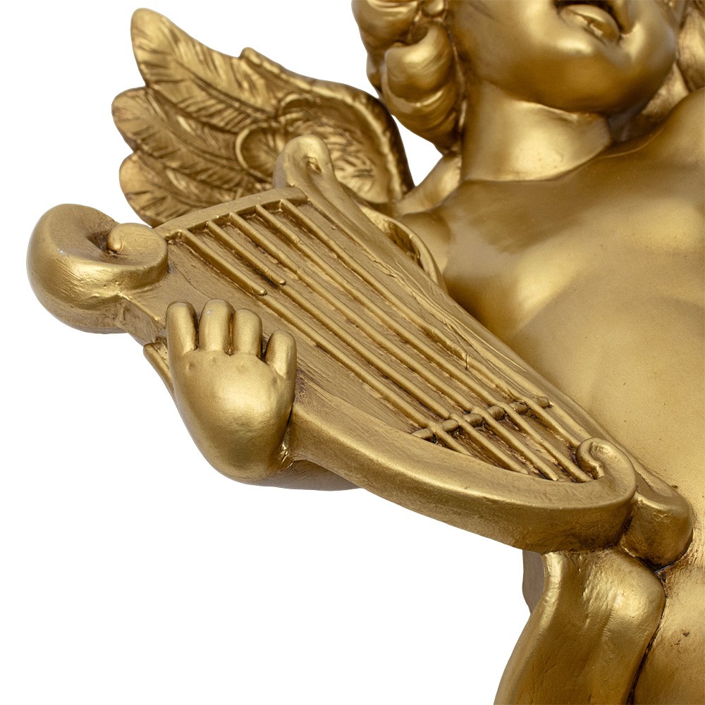 Statua angelo volante con lira realizzata in resina color porporina oro.