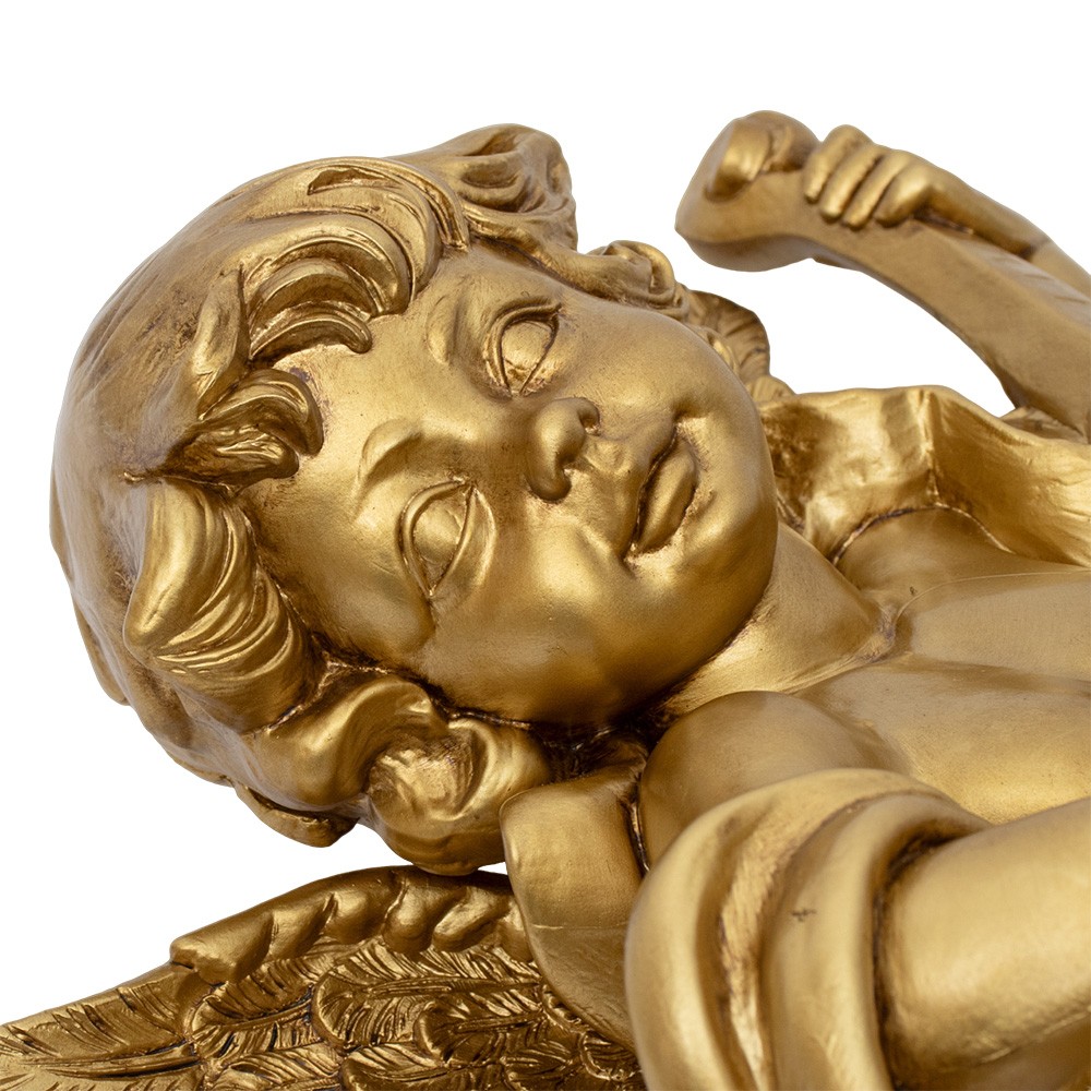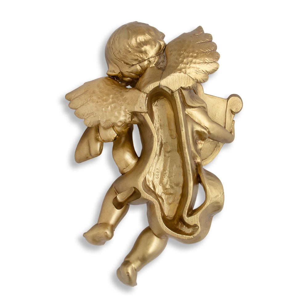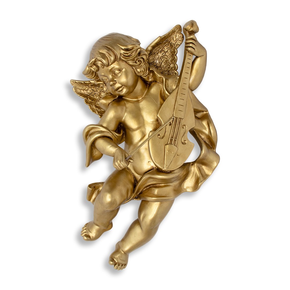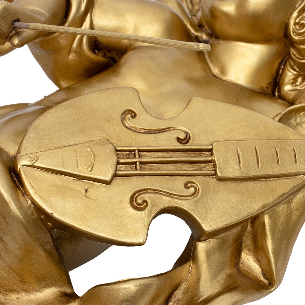 Statua angelo volante con violino realizzata in resina color porporina oro.