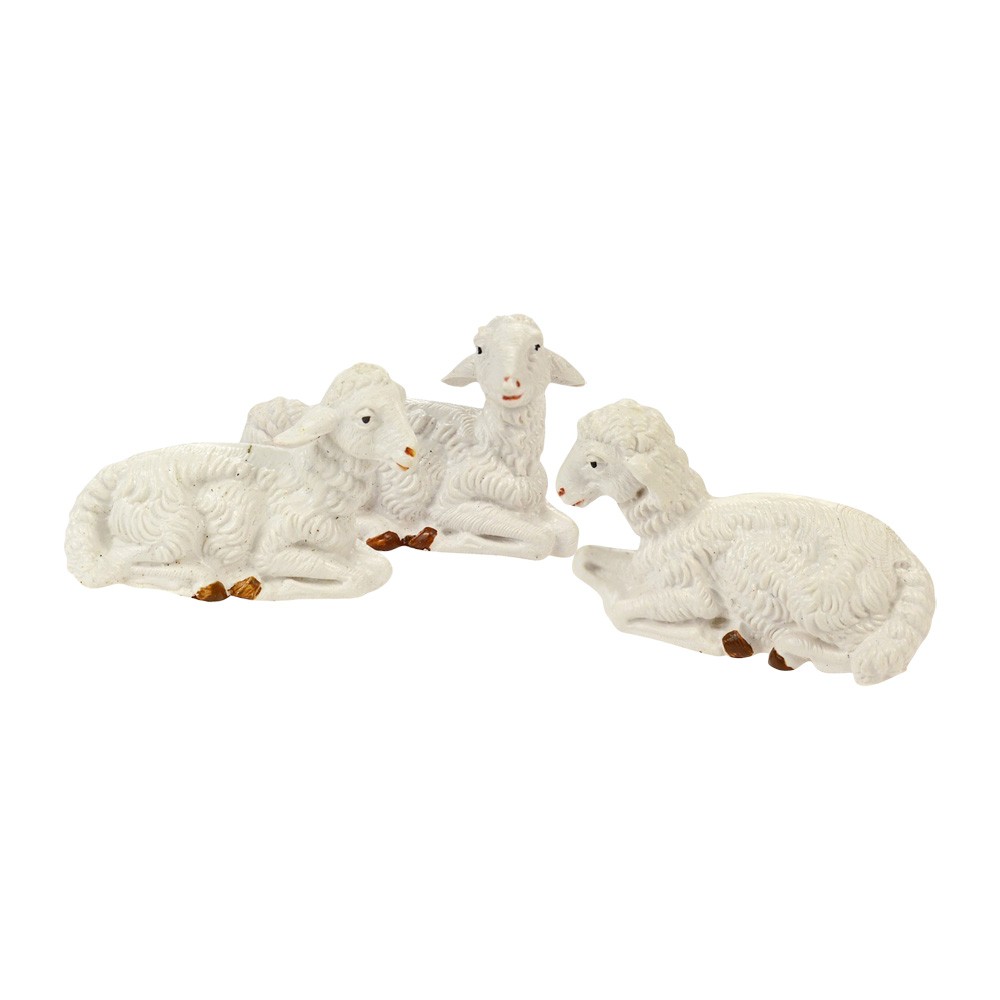 Gruppetto di 3 pecorelle sedute proporzionate per statue presepe alte da 10 cm.