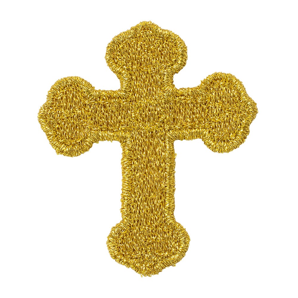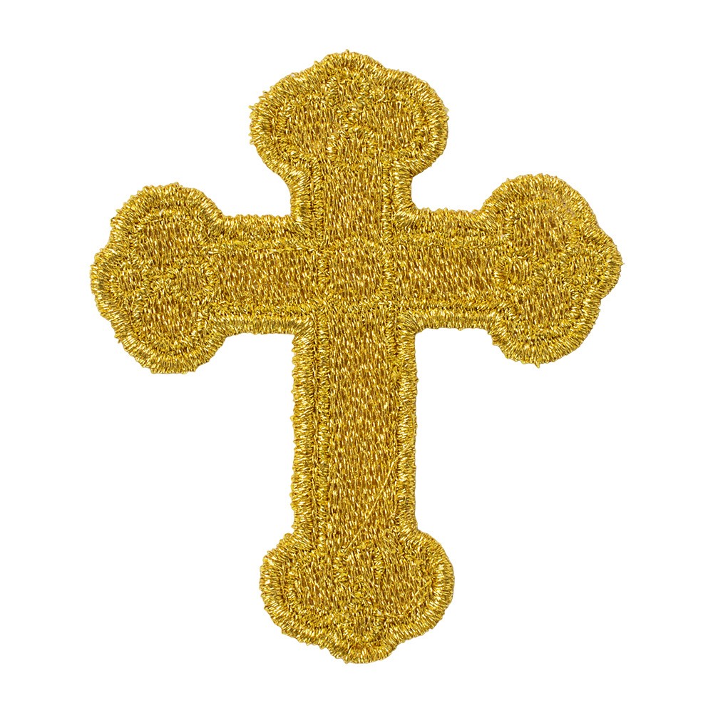 Croce trilobata applicazione ricamata completamente a macchina con filati metallici color oro, adatta per impreziosire paramenti liturgici.