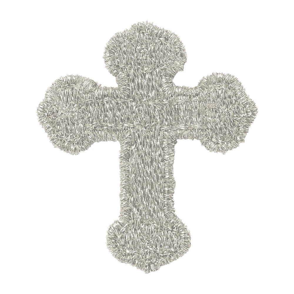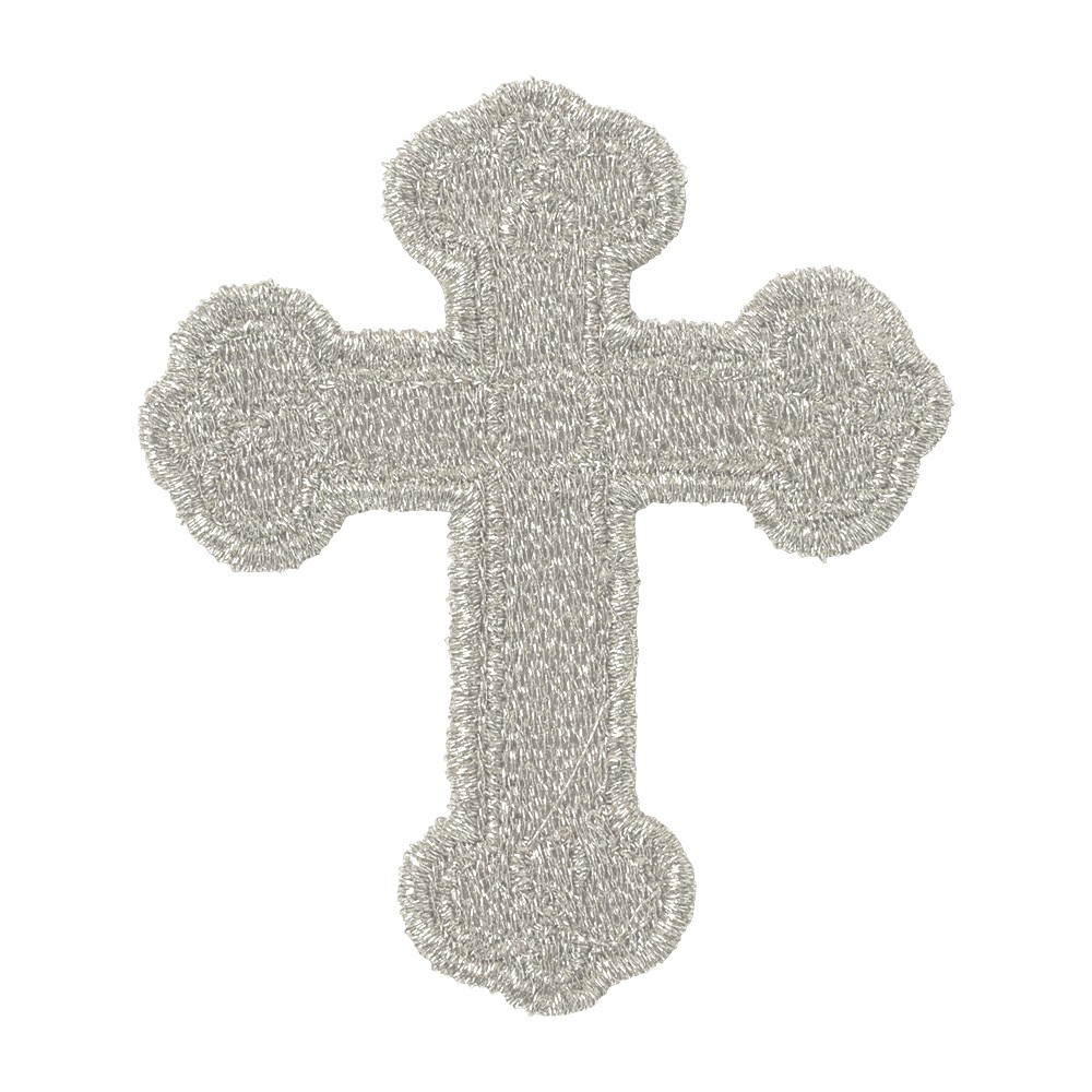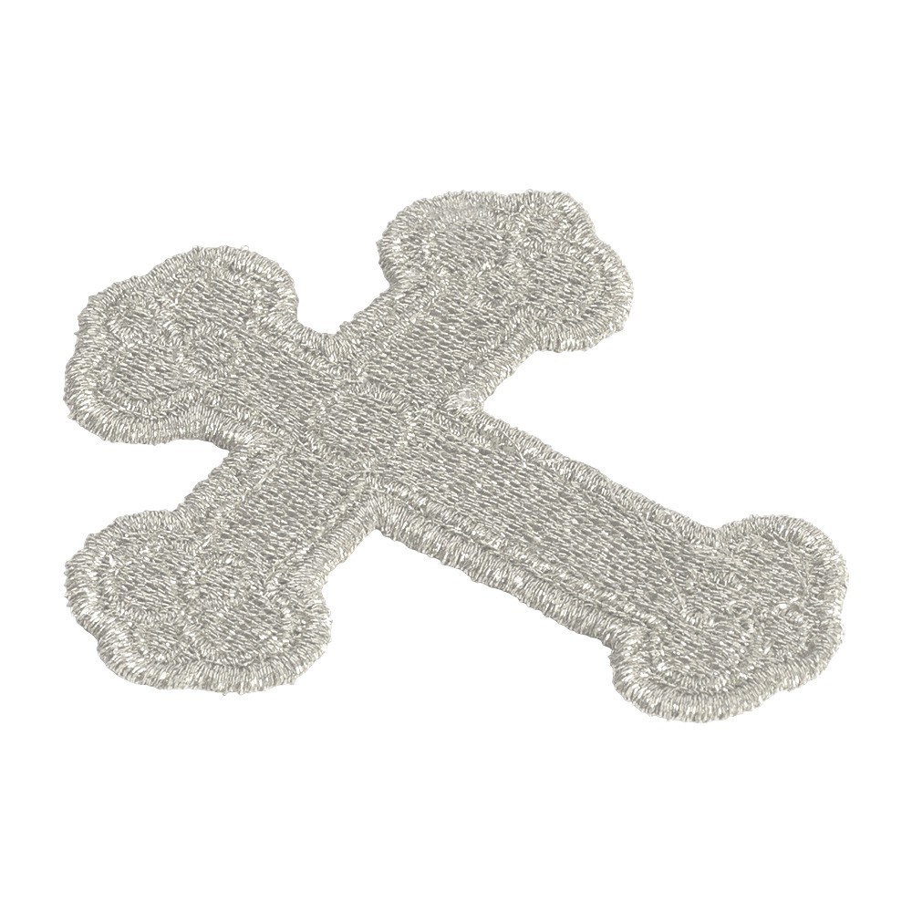 Croce trilobata applicazione ricamata completamente a macchina con filati metallici color argento, adatta per impreziosire paramenti liturgici.