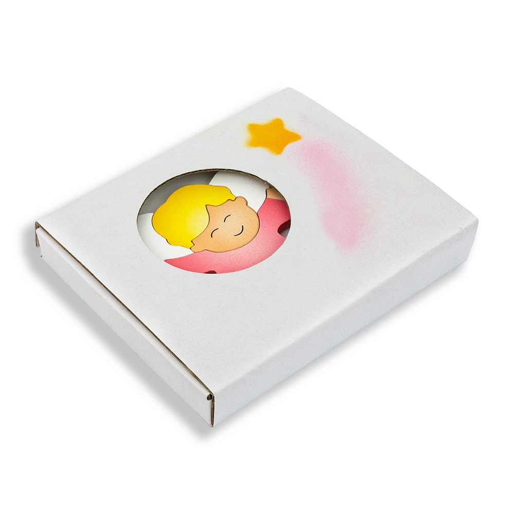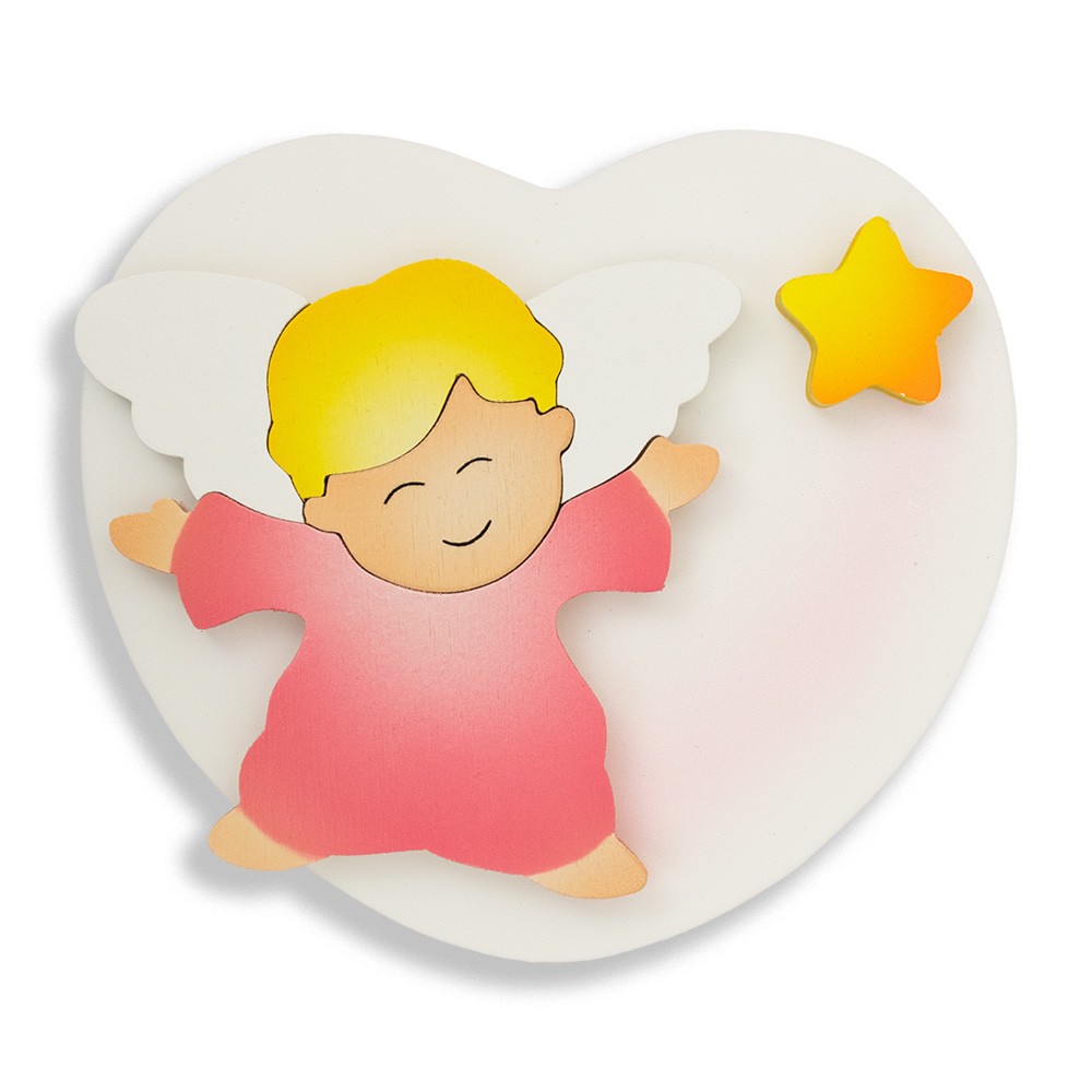 Carinissimo quadretto in legno a forma di cuore, realizzato a mano dalla comunità dei focolari di Loppiano, raffigura un cuore bianco con un angelo in veste rosa.