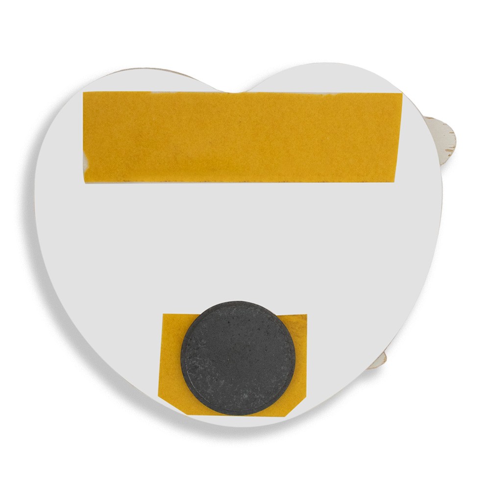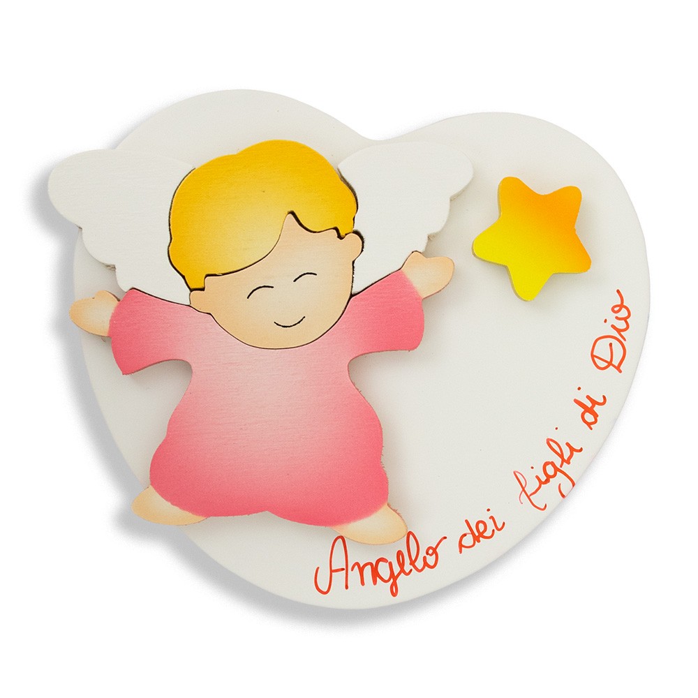 Quadretto per cameretta in legno a forma di cuore, realizzato a mano da giovani artigiani della comunità dei focolari di Loppiano, raffigurante un cuore bianco con un angelo in veste rosa e scritta "Angelo dei figli di DIO".