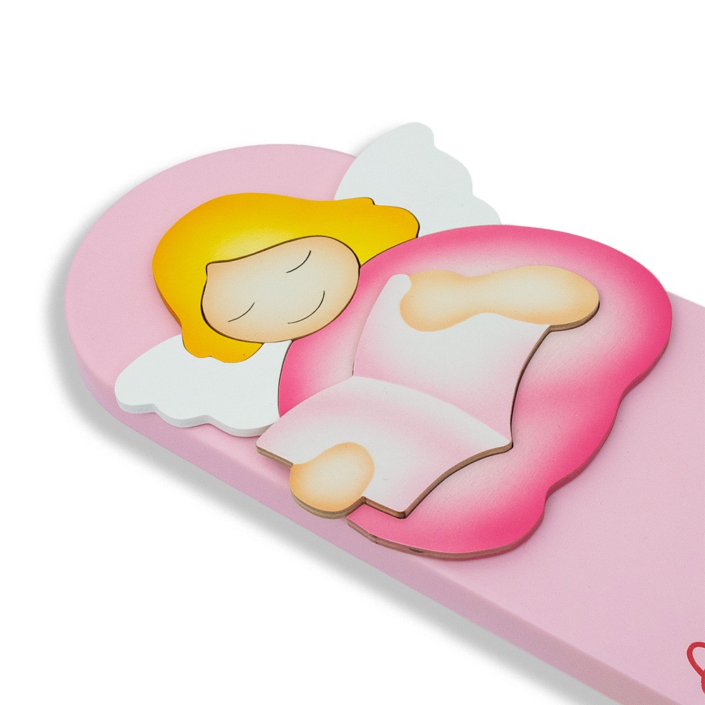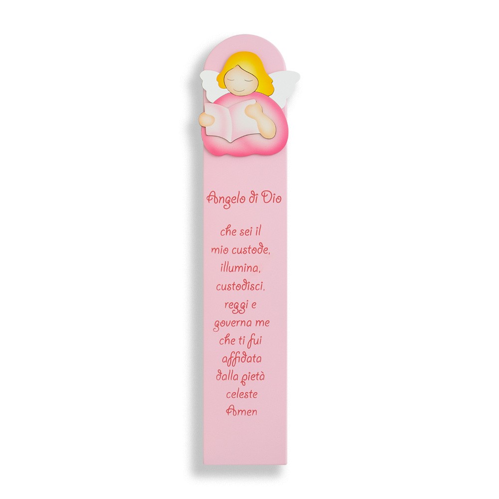 Realizzato interamente in legno dipinto di rosa con sagoma in rilievo di un angioletto con veste rosa e sotto è riportata la preghiera Angelo di DIO.