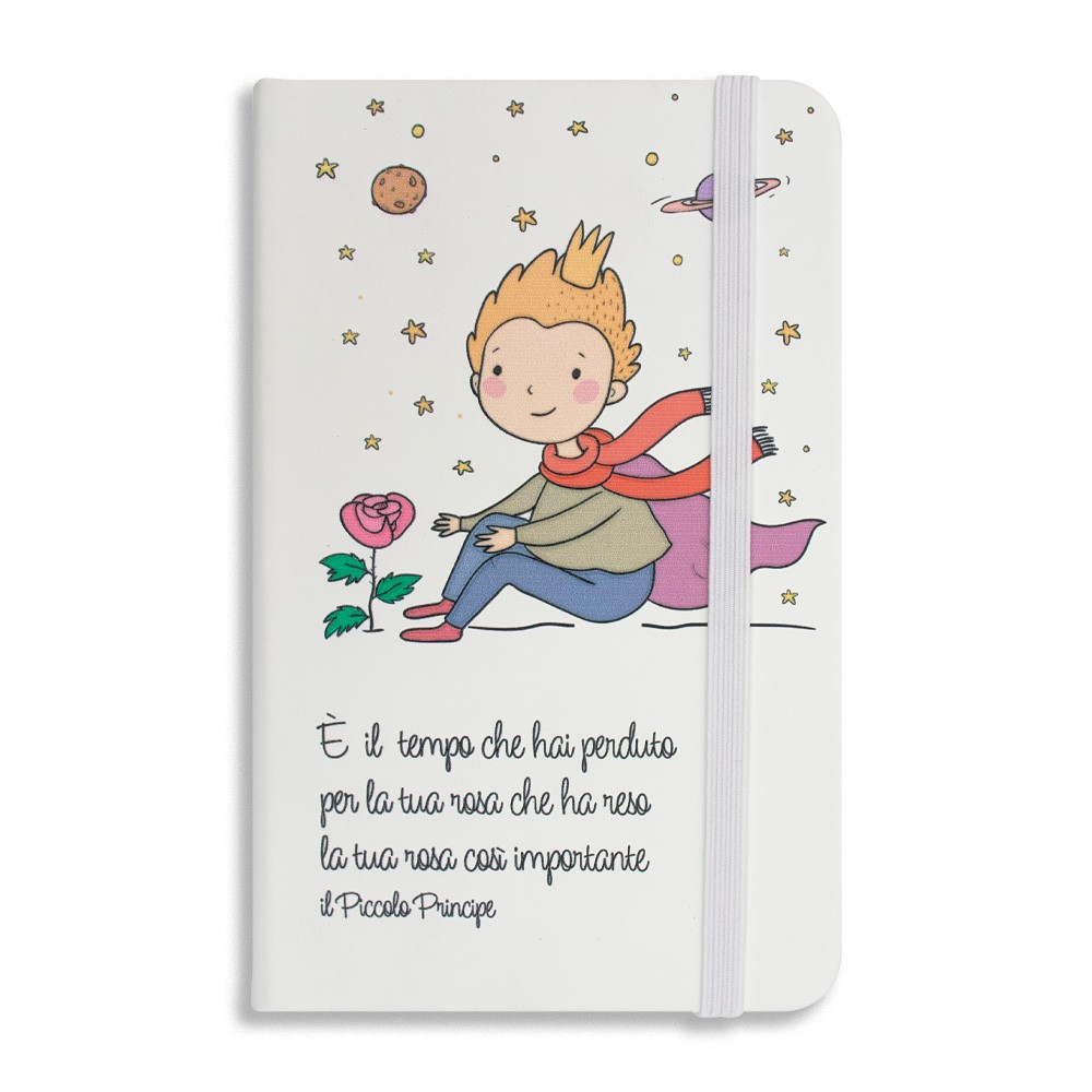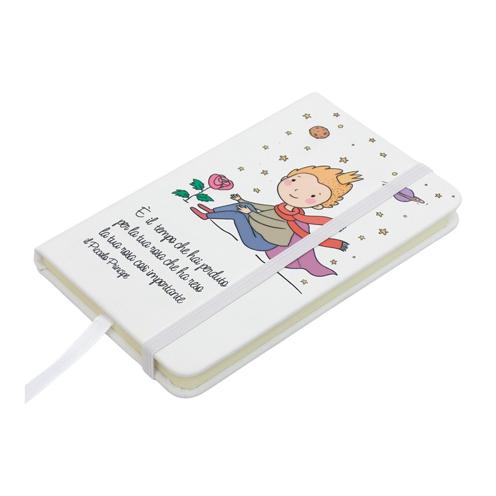 Taccuino tascabile linea Piccolo Principe, con copertina rigida e un pratico elastico per la chiusura.