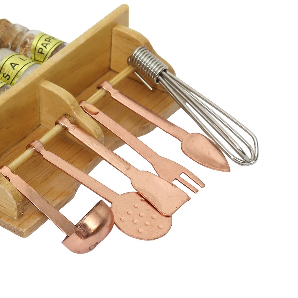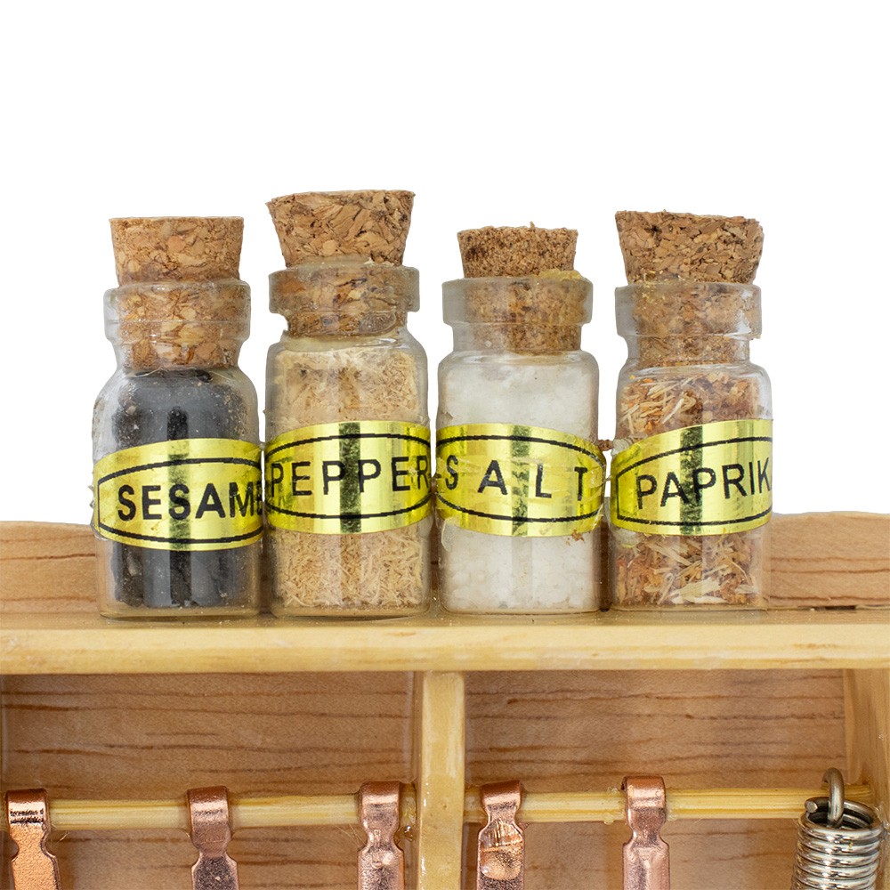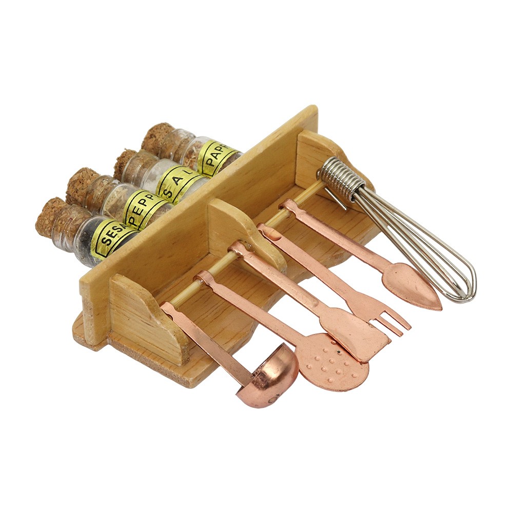 Ripiano da cucina in legno completo di mestoli color rame e barattoli per spezie con tappi in sughero, adatto per il presepe.
