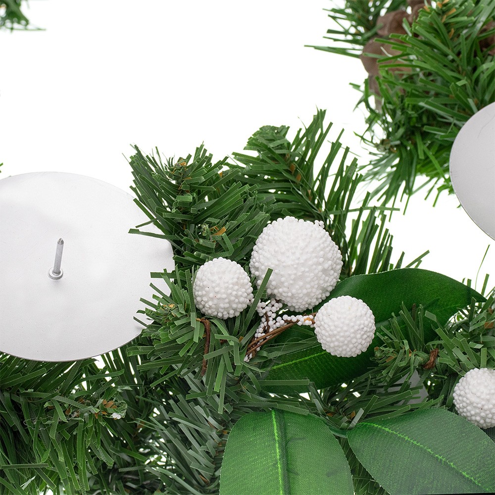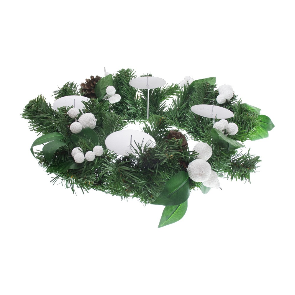 Corona o ghirlanda dell'avvento decorata con rami di pino artificiale e palline bianche che simulano la neve.