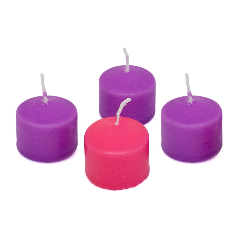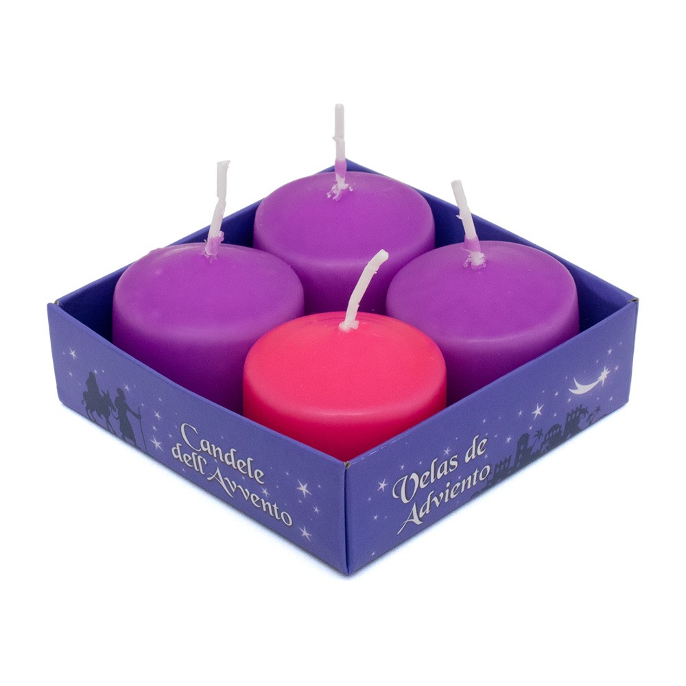 La confezione comprende 3 candele viola e una candela rosa, in cera opaca, di diametro 4 cm circa e altezza 2,5 cm.