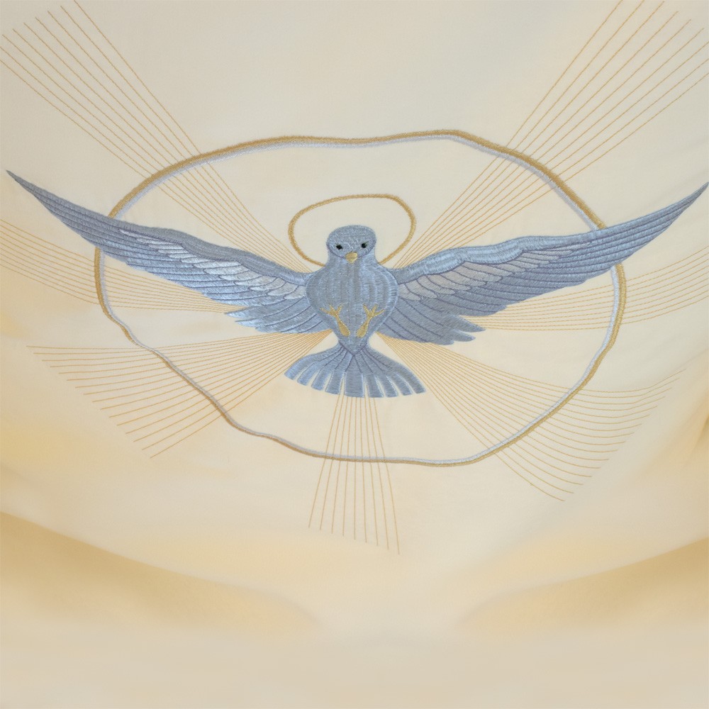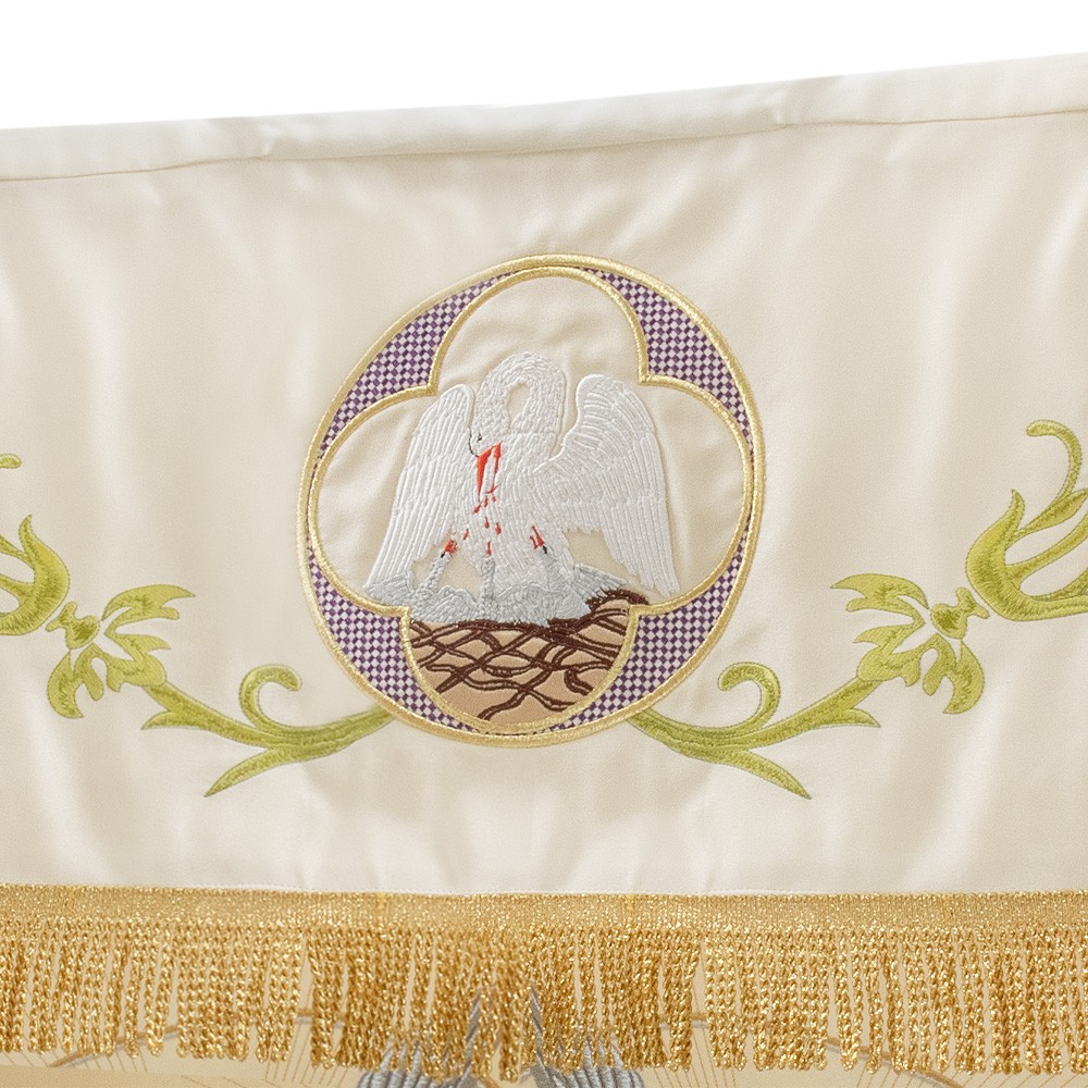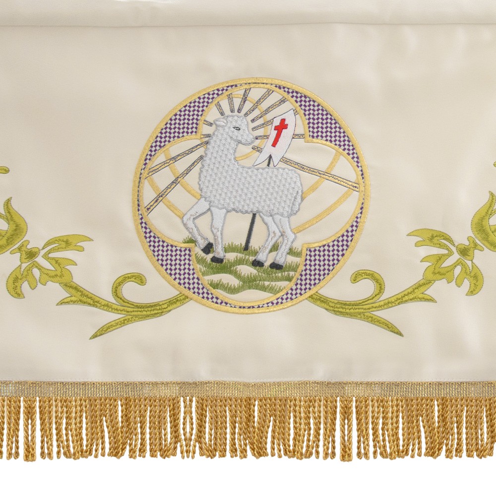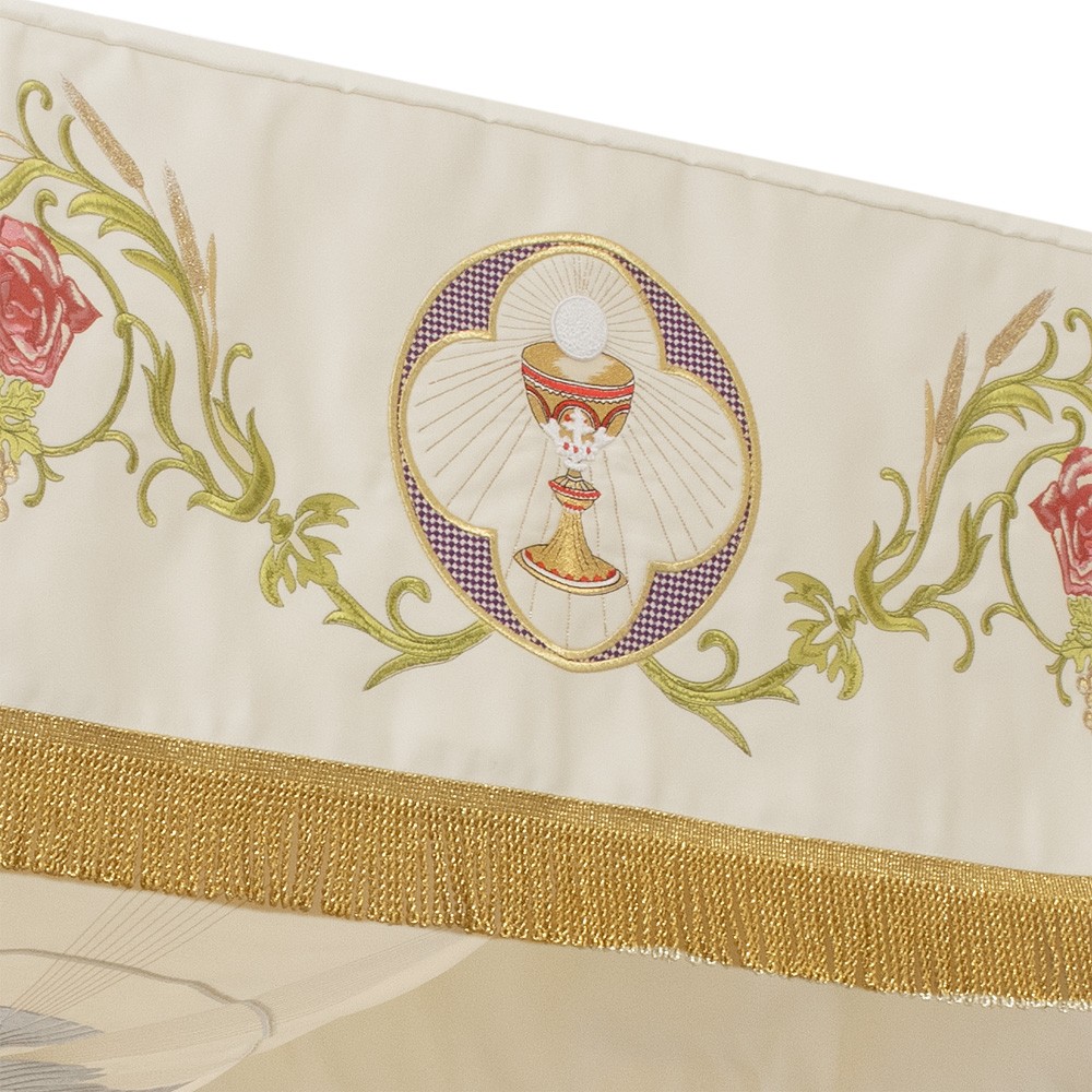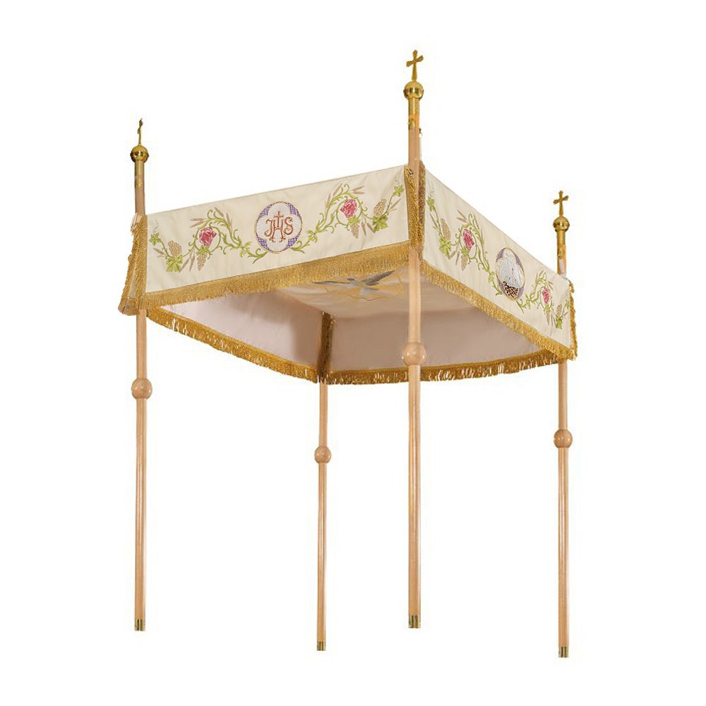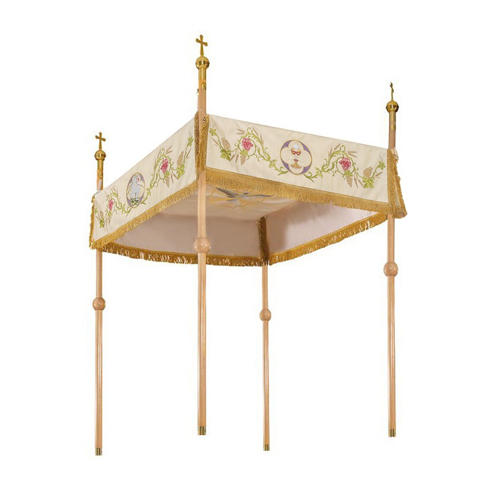 Realizzato in ottimo e resistente poliestere, i ricami presenti su questo baldacchino raffigurano il calice eucaristico, l'agnello pasquale e il simbolo JHS contornate da rose e varie decorazioni.