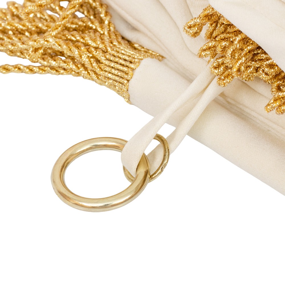 Confezionato in resistente poliestere e arricchito con ricami e frangia dorata.