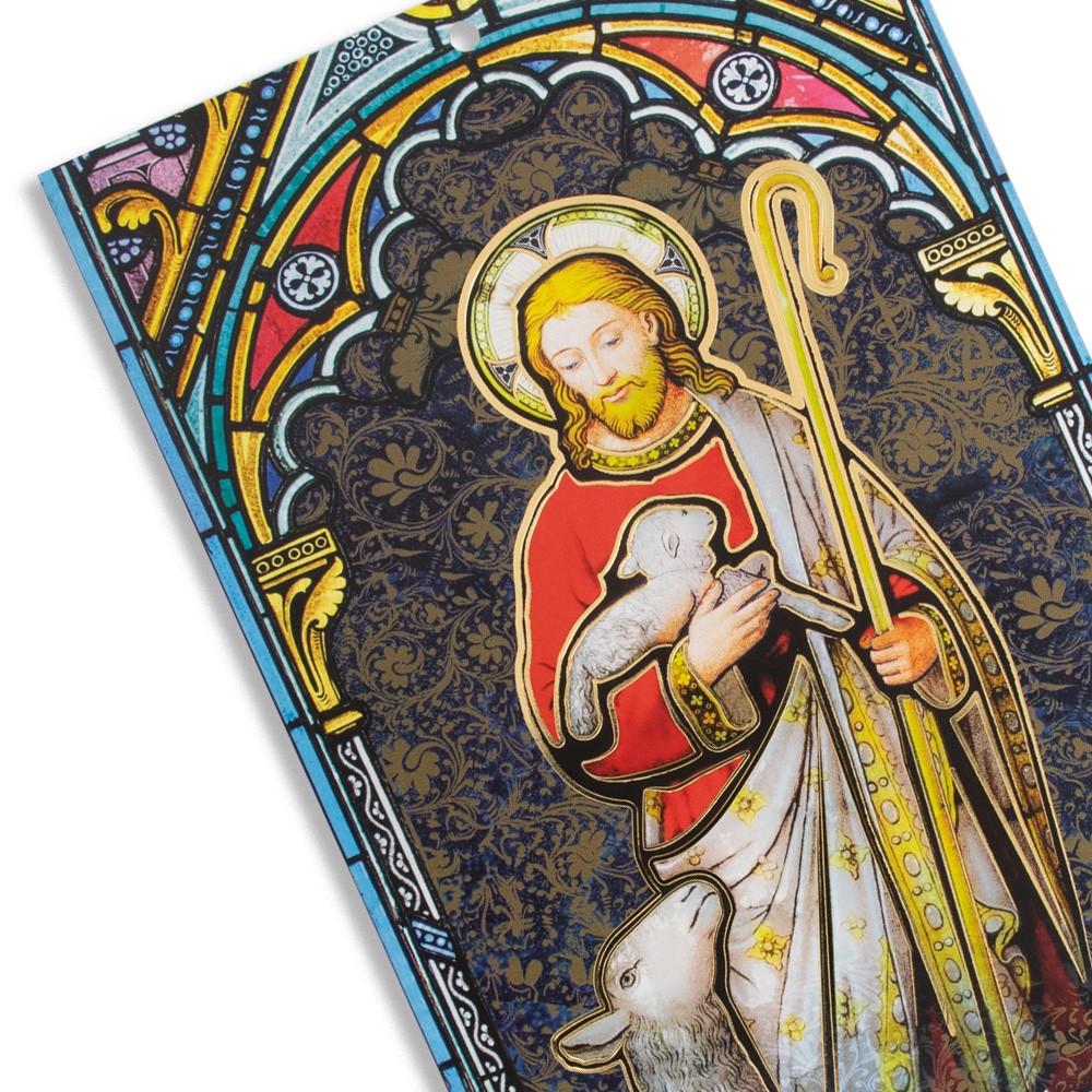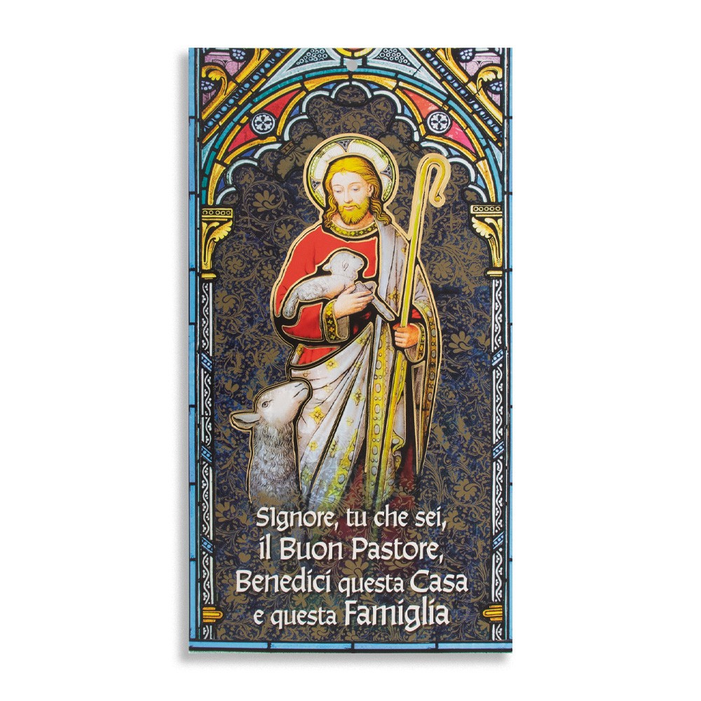 L'immagine del cartoncino raffigura Gesù Buon Pastore con particolari in oro a caldo e frase stampata " Signore, tu che sei, il Buon Pastore, Benedici questa Casa e questa Famiglia".