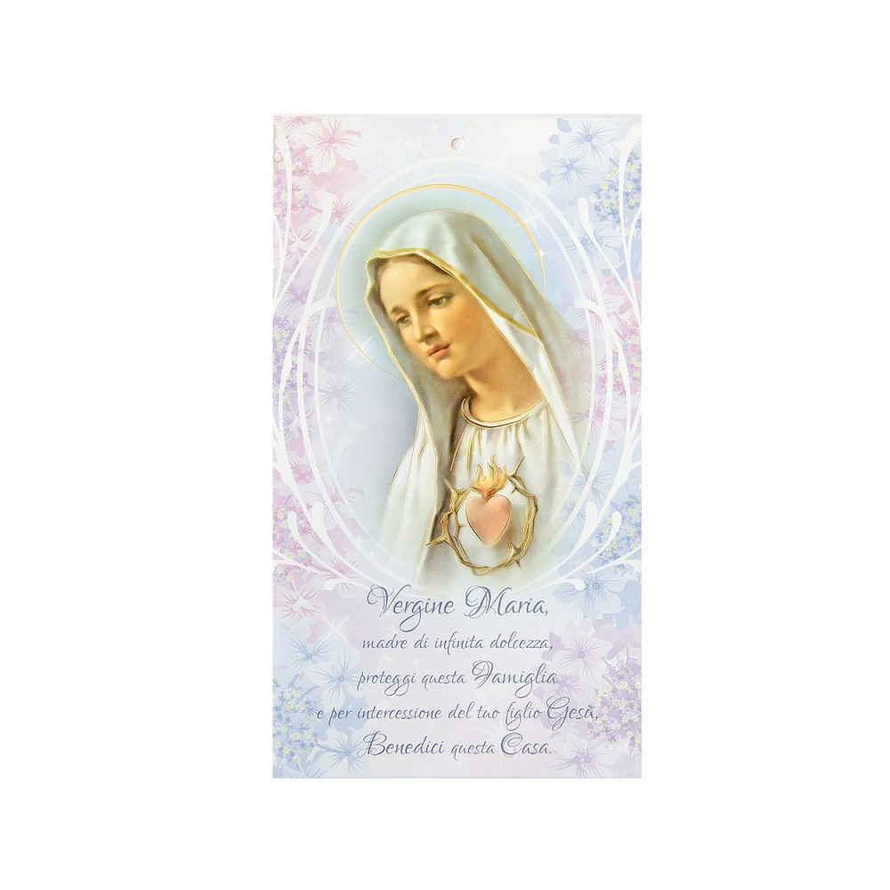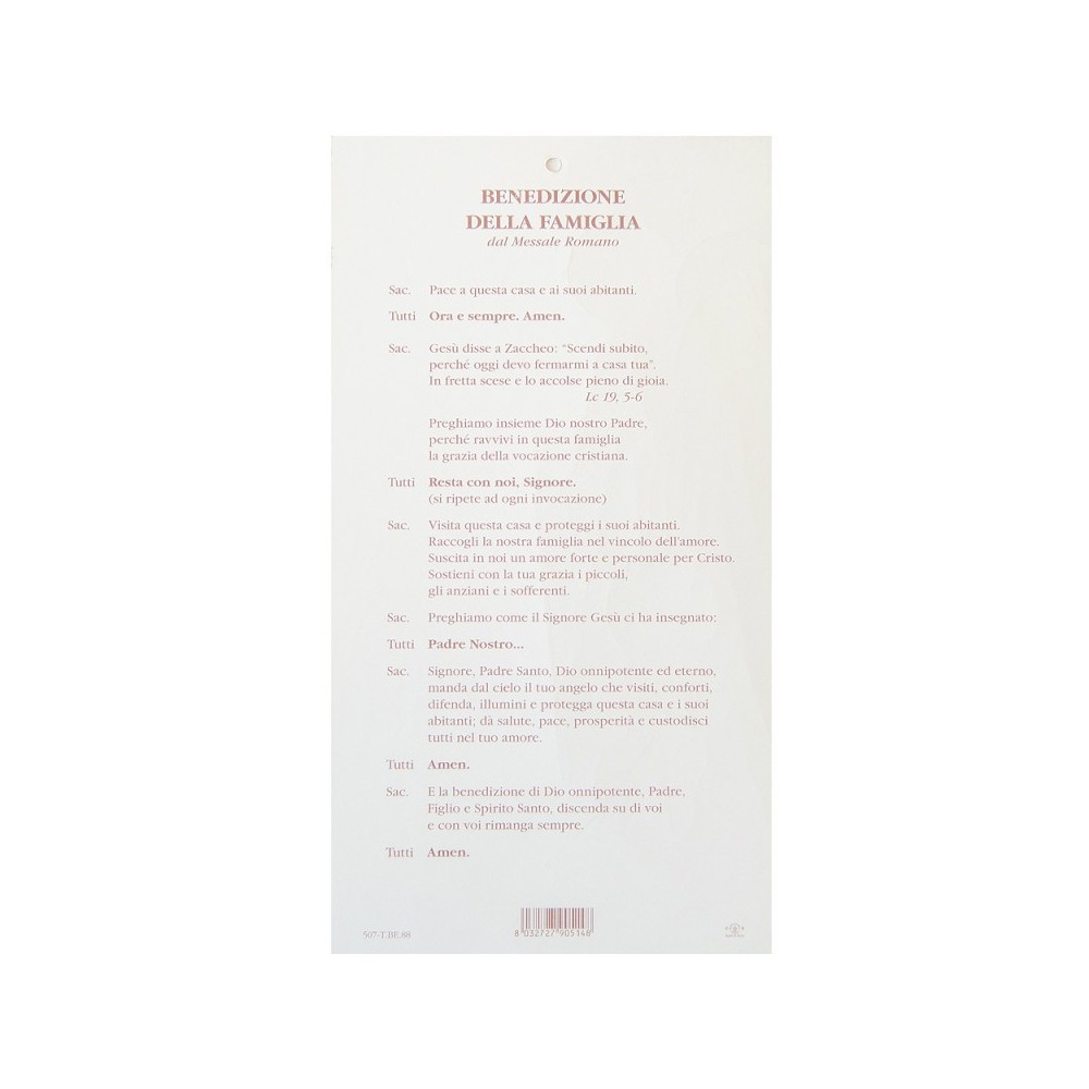 Il formato del cartoncino è 22 x 12 cm, con riflessi in oro e forellino per appenderlo al muro. Sul retro è riportata la preghiera di benedizione per le famiglie.