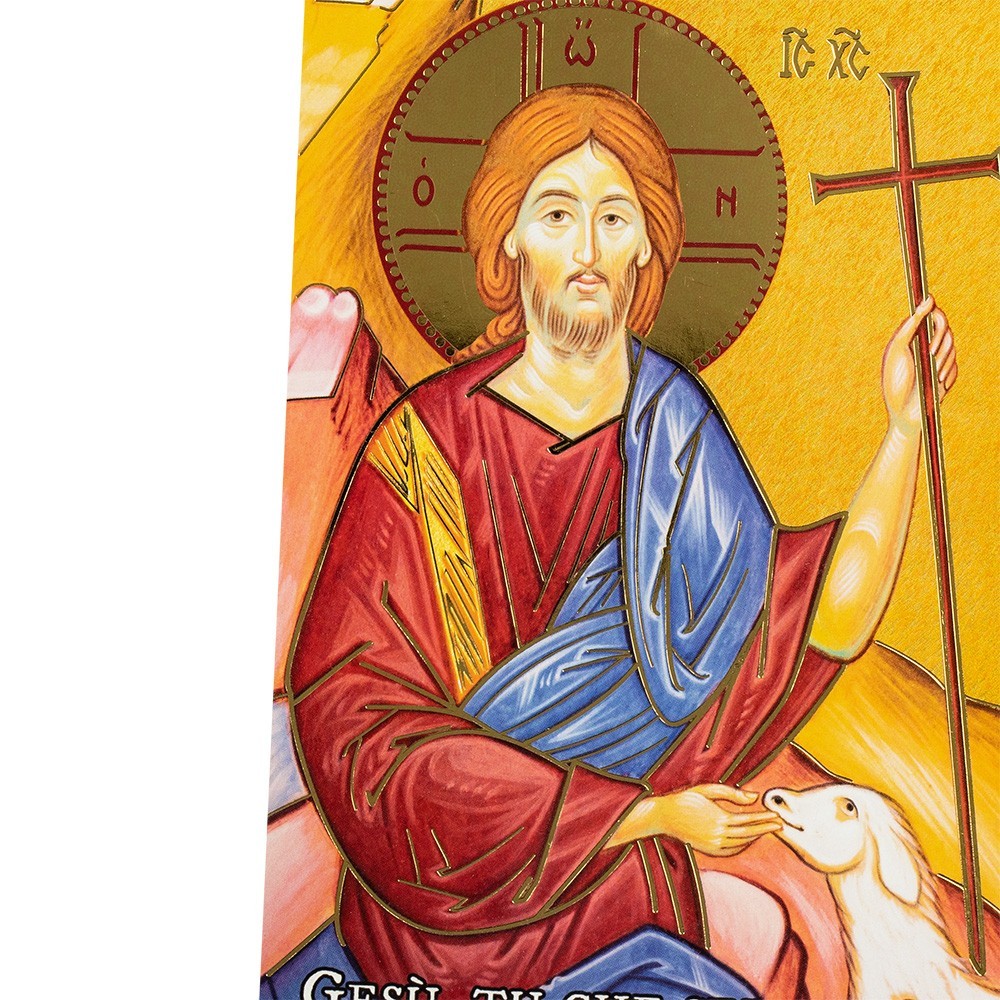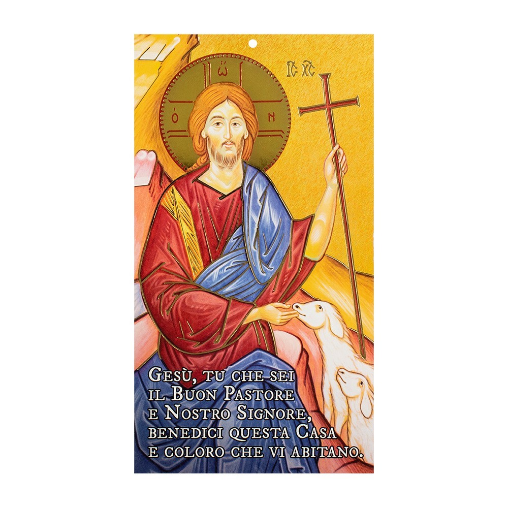 Ogni cartoncino è di forma rettangolare (formato 22x12 cm) con immagine oro a caldo raffigurante Gesù Buon Pastore e frase " Gesù, tu che sei il Buon Pastore e Nostro Signore, benedici questa casa e coloro che vi abitano."