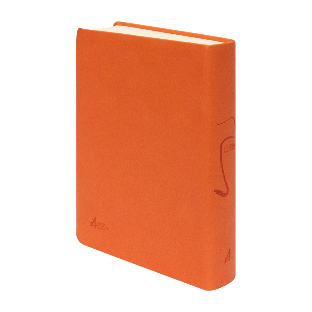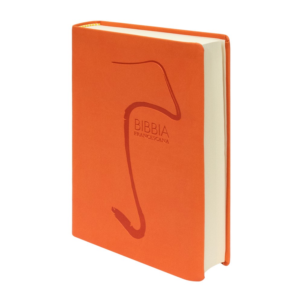 Copertina plastificata di colore arancione, con intaglio di una metà del tau e scritta BIBBIA FRANCESCANA.