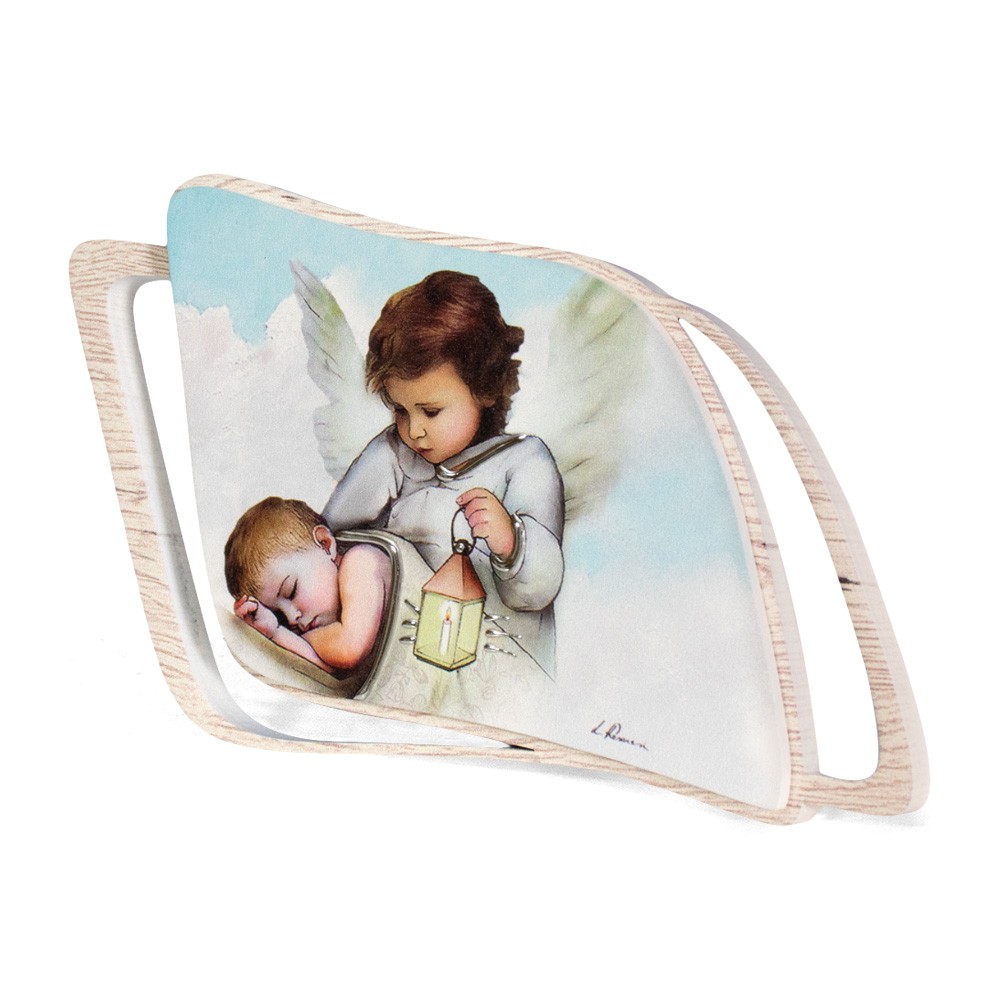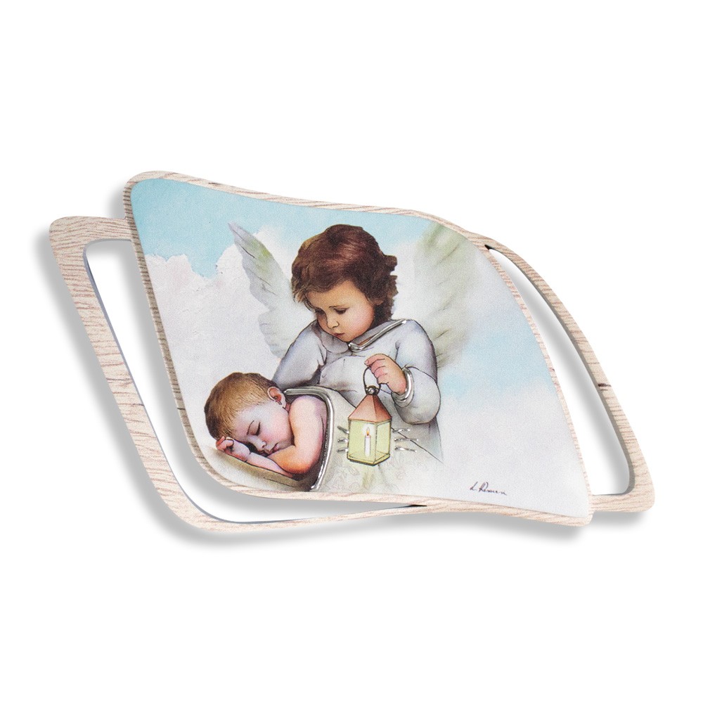 L'immagine dipinta raffigura un angelo custode con un bimbo che dorme, arricchita con decori in argento laminato.