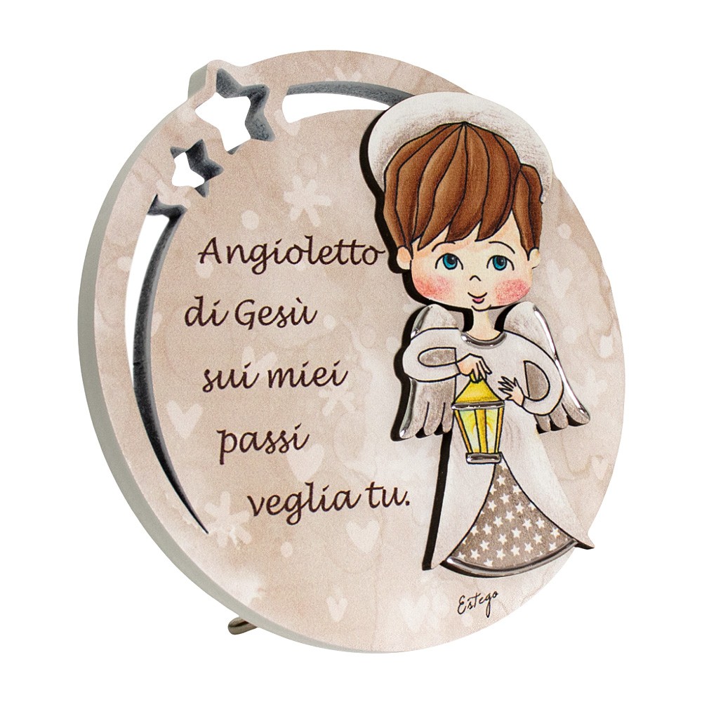 Quadretto colorato in legno con angioletto in rilievo e frase stampata " Angioletto di Gesù su i miei passi veglia tu".