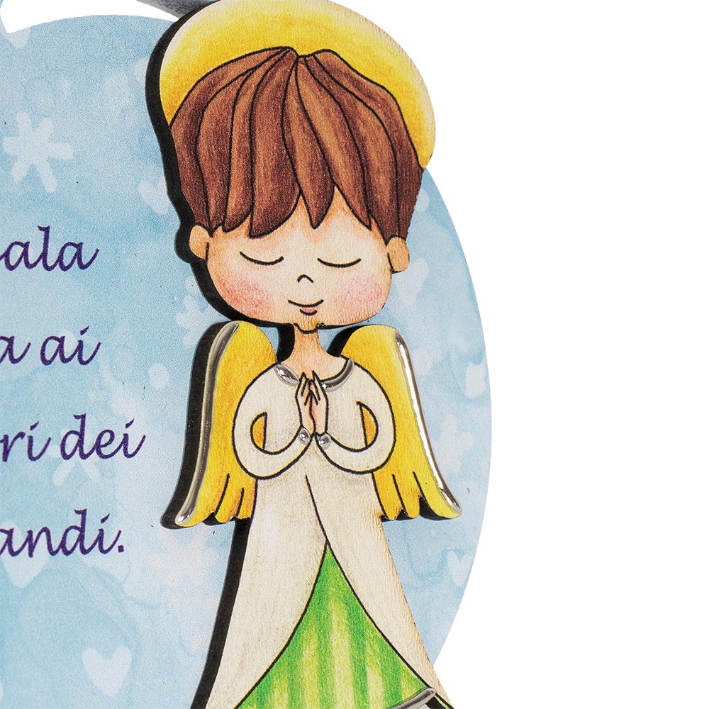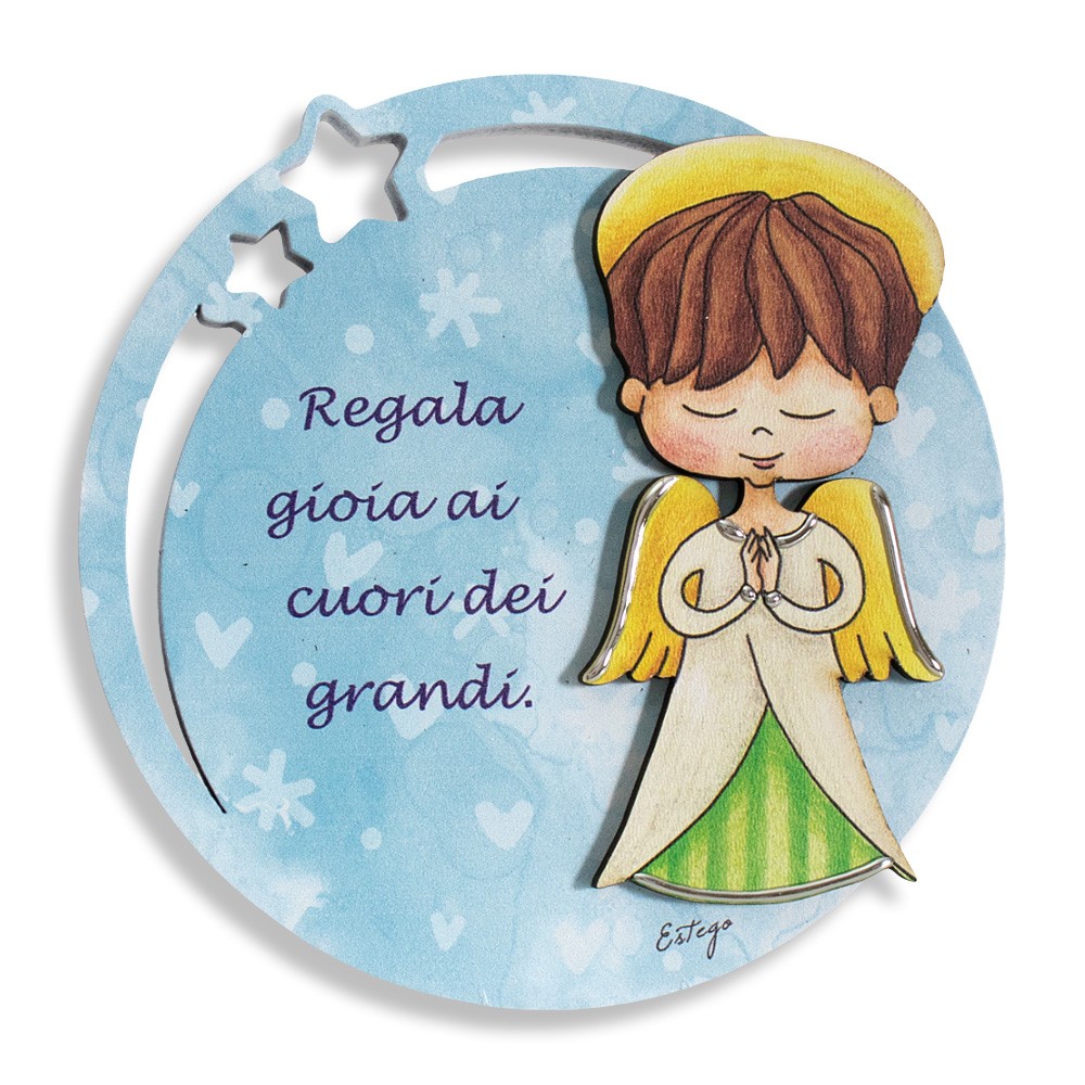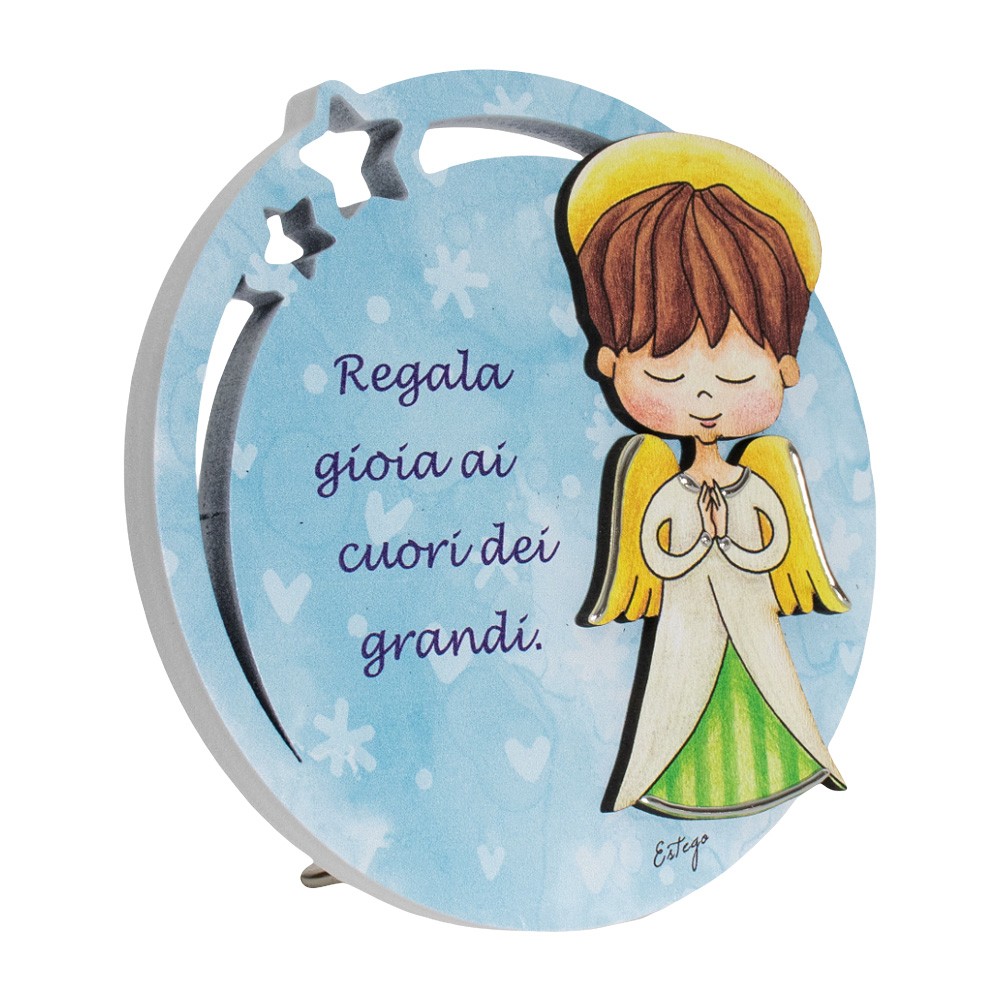 Quadretto di forma tonda per bambini realizzato in legno colorato con fondo celeste e sagoma in rilievo di un angioletto.