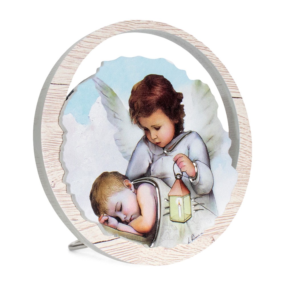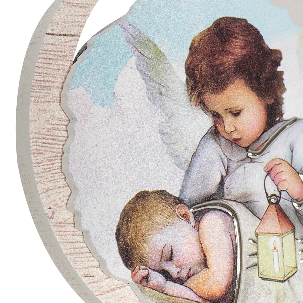 Realizzato in legno con fondo colori pastello e immagine raffigurante un Angelo Custode con bambino, arricchito con applicazioni in argento laminato.
