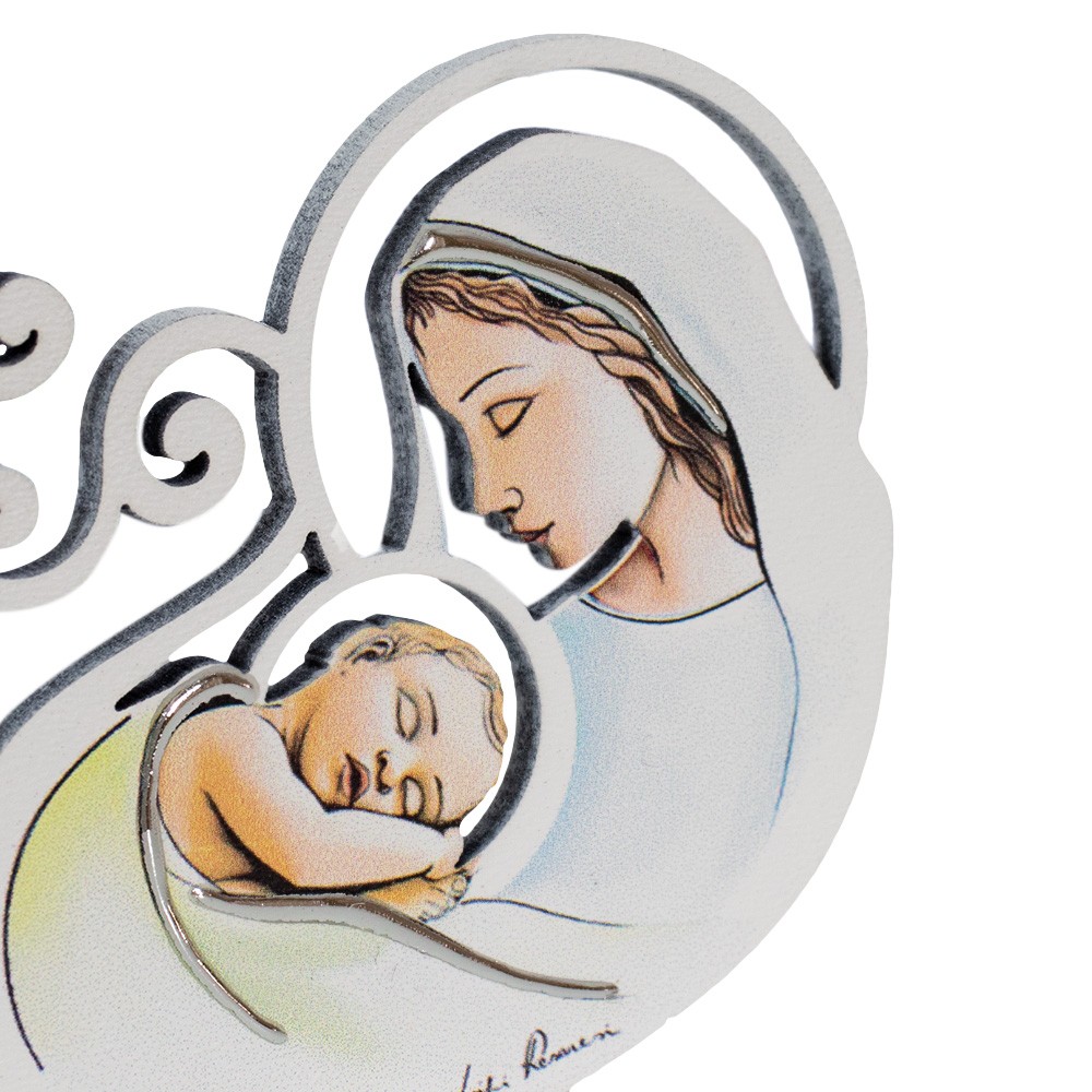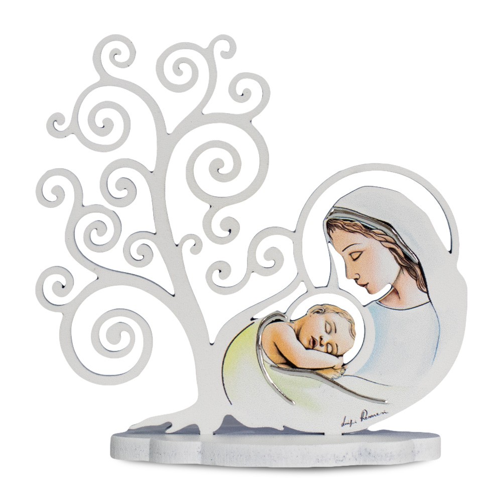 Questo quadretto è d'appoggio in legno bianco con inserti in argento laminato. Raffigura l'albero della vita con l'immagine di un bimbo che dorme tra le braccia della mamma.