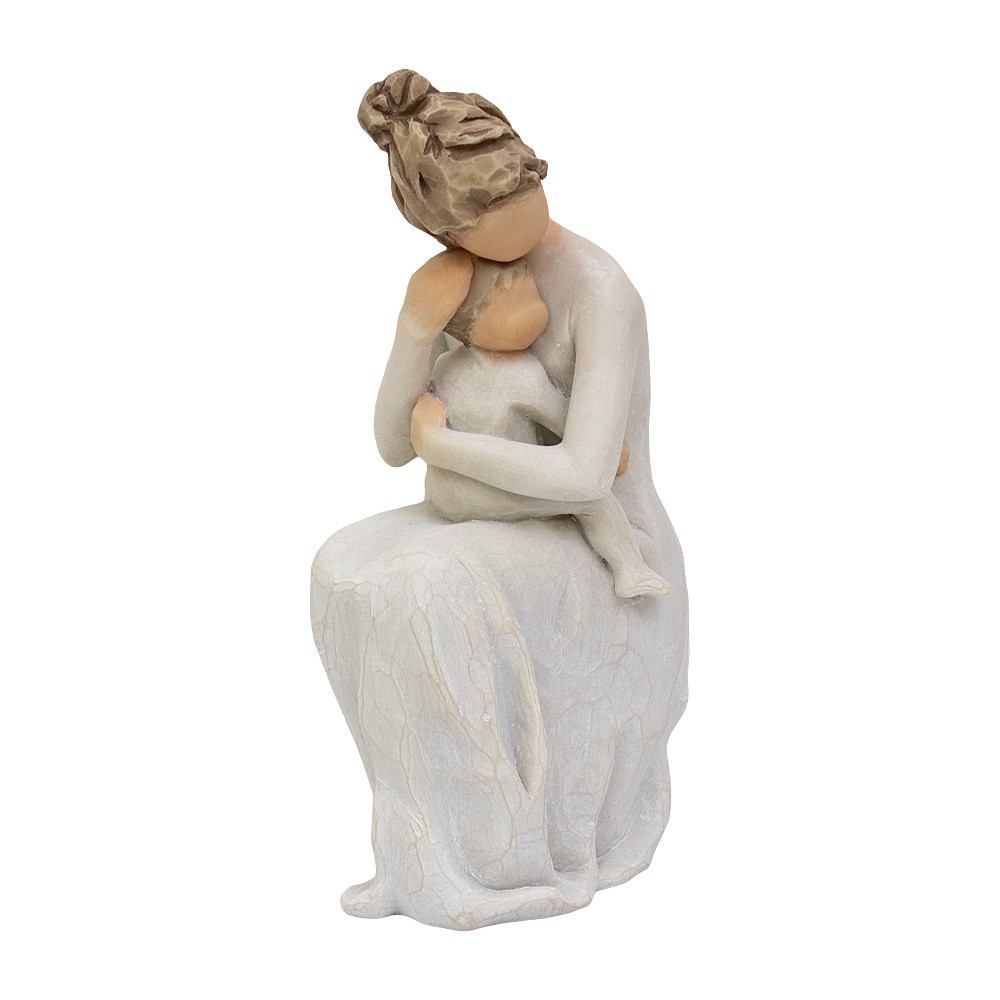 La statuetta è in resina con colorazione effetto legno, raffigura una mamma con sua figlia in braccio.
