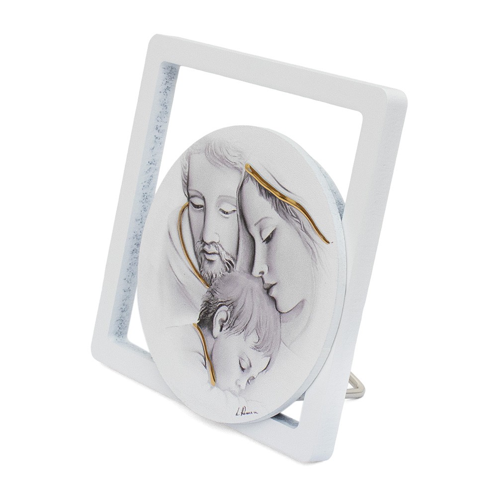 Carinissimo quadretto in legno chiaro con immagine raffigurata della Sacra Famiglia dipinta con colori pastello e impreziosita con inserti dorati.