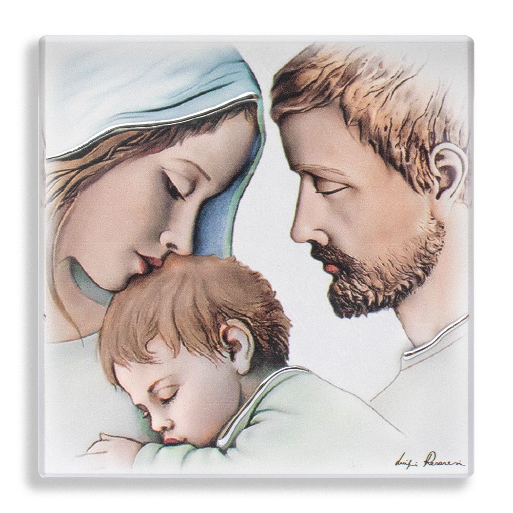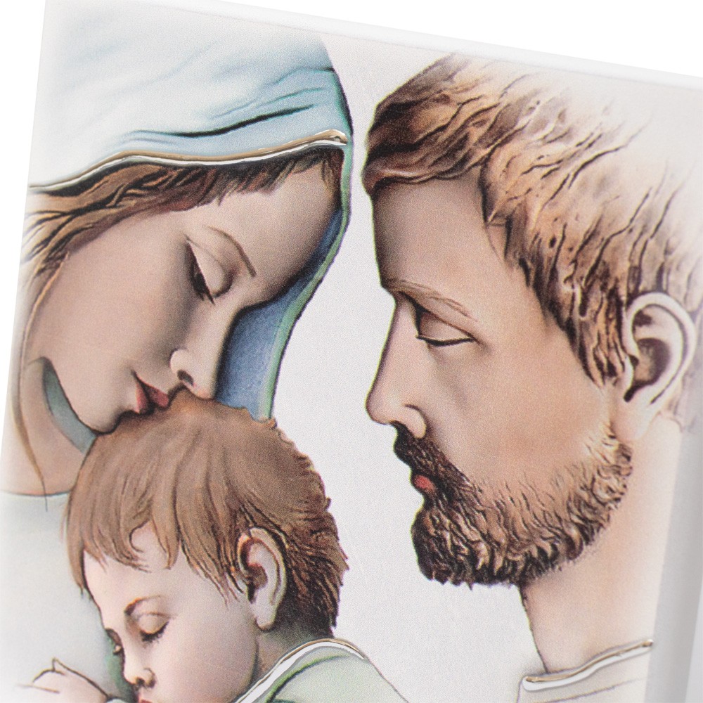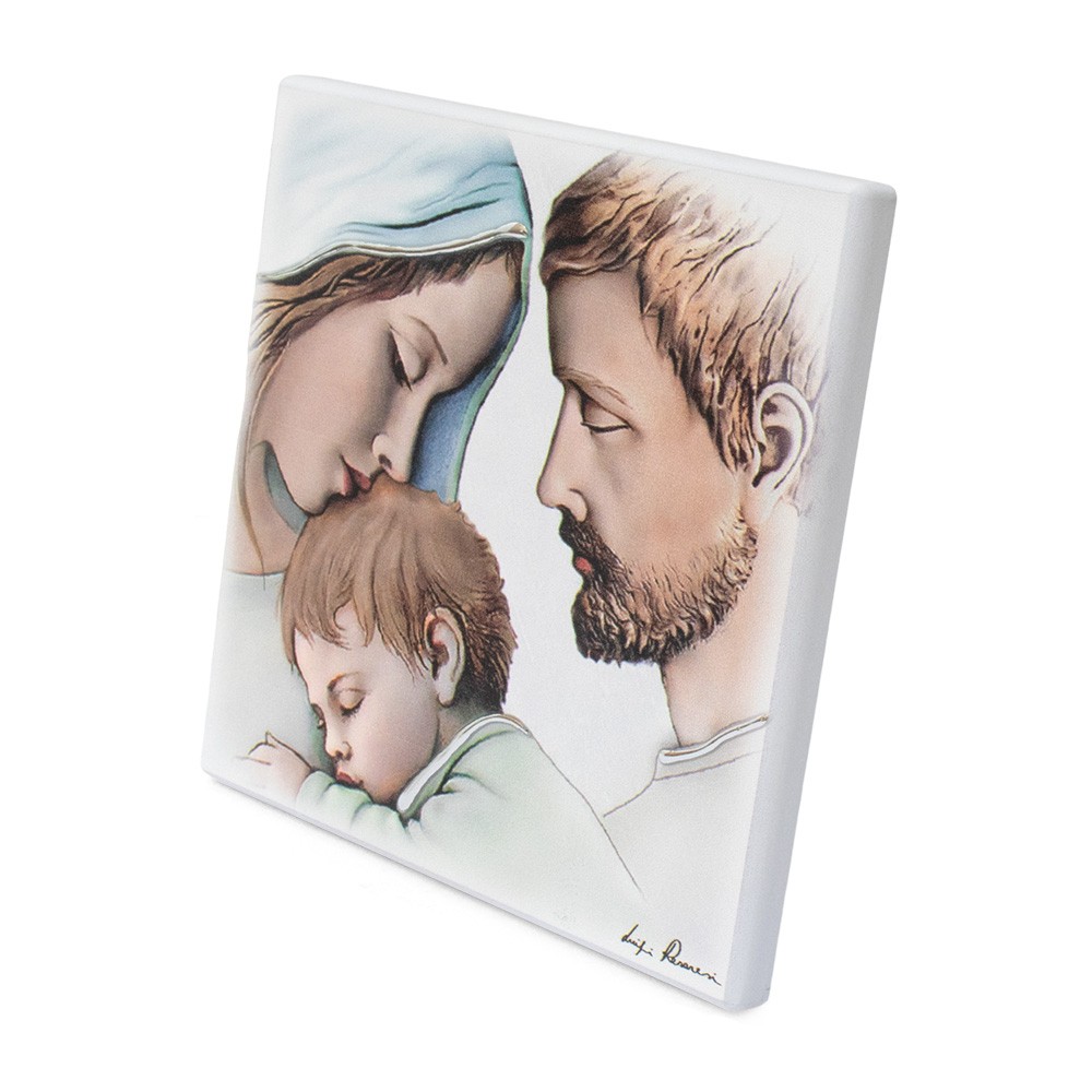 Quadretto della Sacra Famiglia realizzato su un pannello in legno bianco e impreziosito con inserti in argento bilaminato.