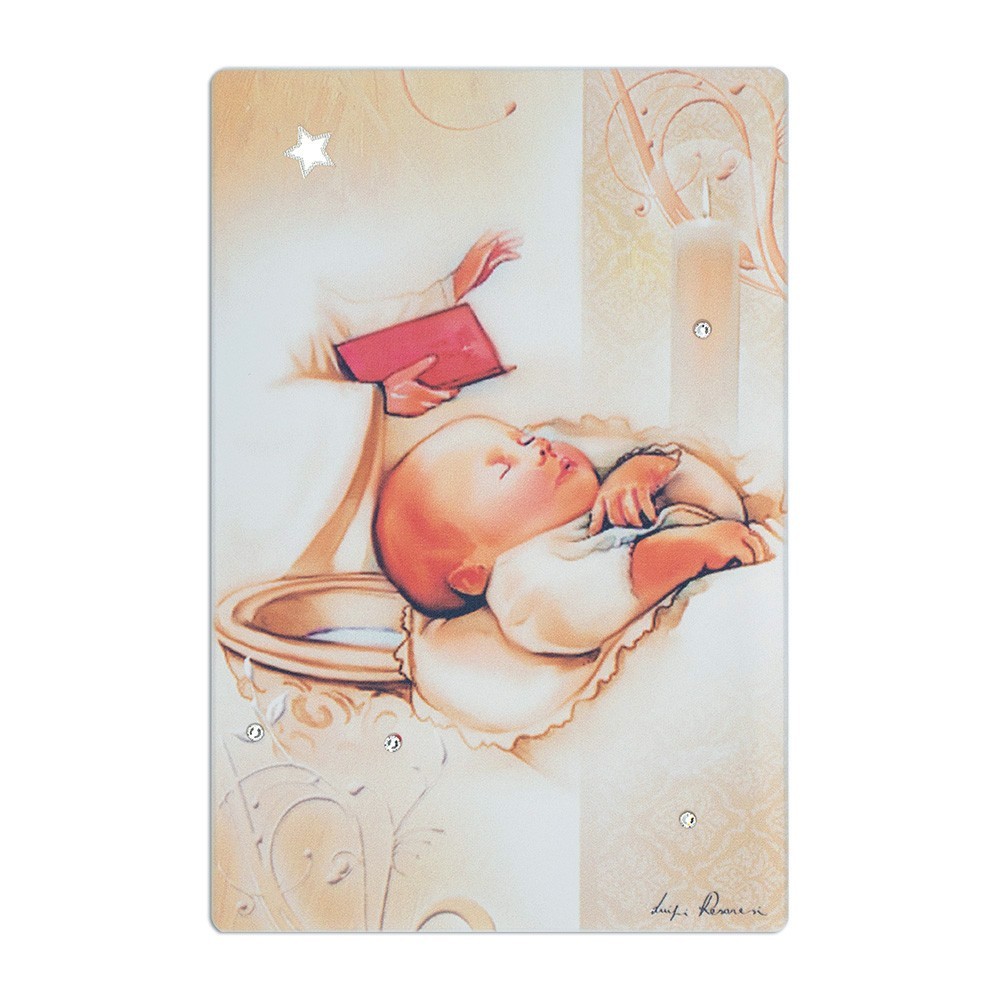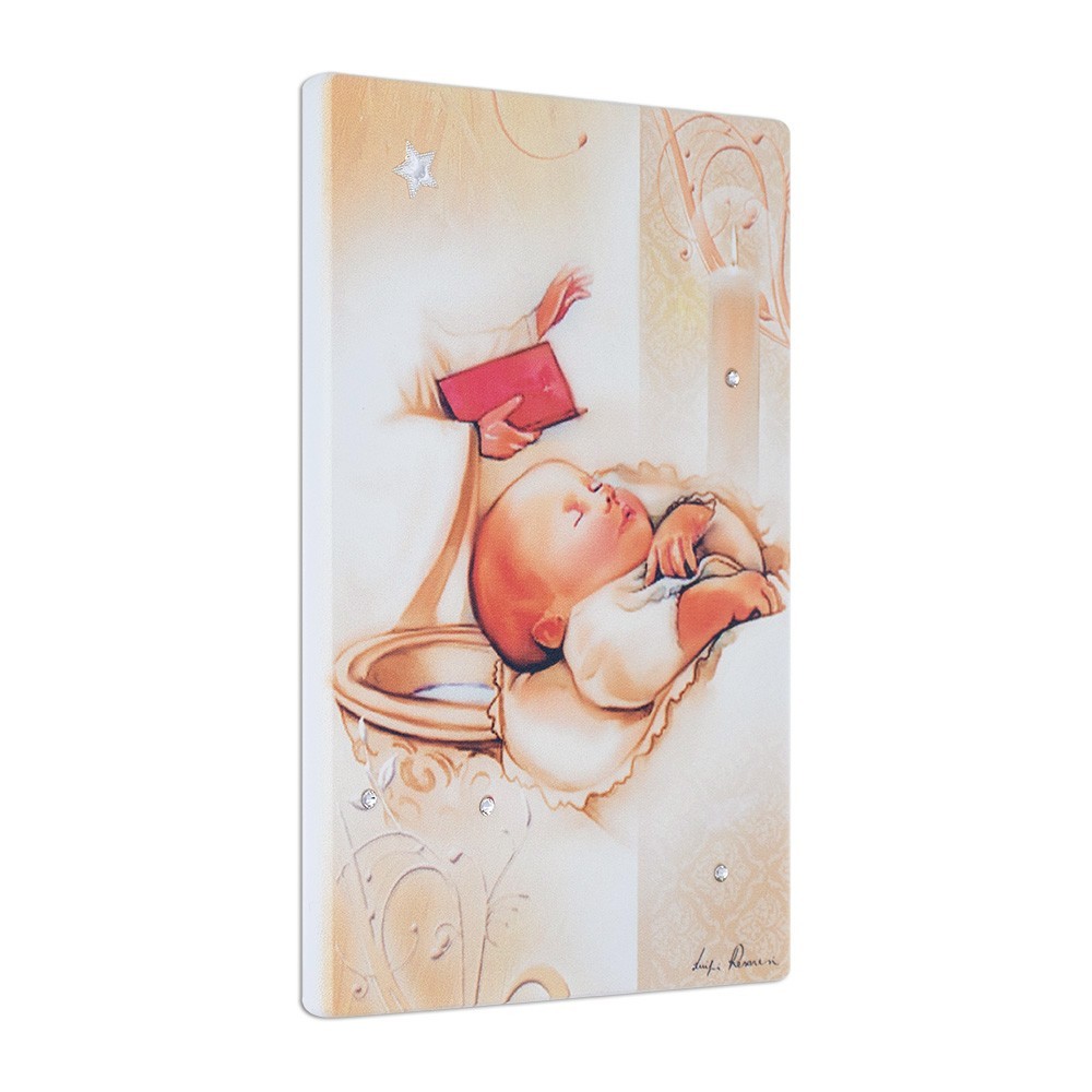 Questo piccolo quadretto (formato 10x15 cm) è arricchito con strass e stellina in argento. Può essere usato sia da parete che d'appoggio, adatto come bomboniera per il Battesimo o nascita.