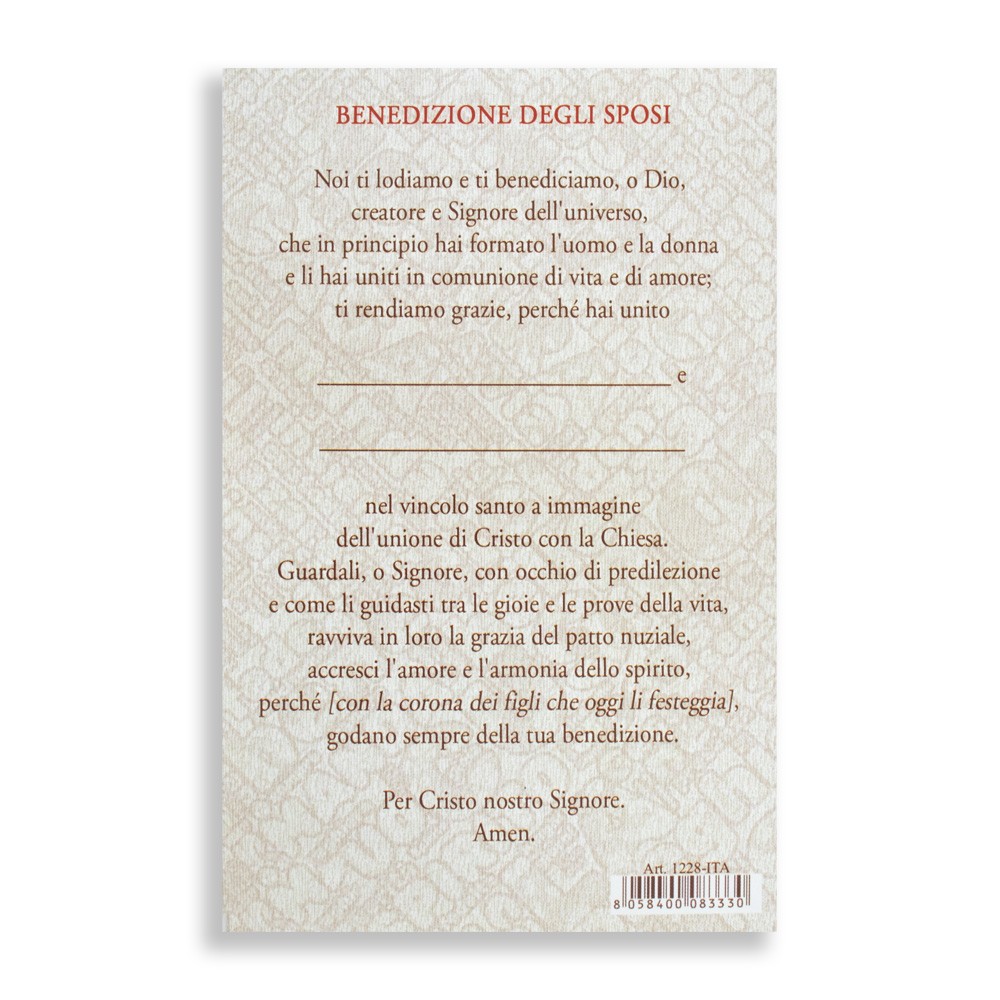 Ideata per la Festa della Famiglia, è confezionata in una pratica bustina trasparente con pieghevole che contiene il rinnovo delle promesse matrimoniali, rendendola un dono perfetto per coppie, parrocchie e comunità religiose.