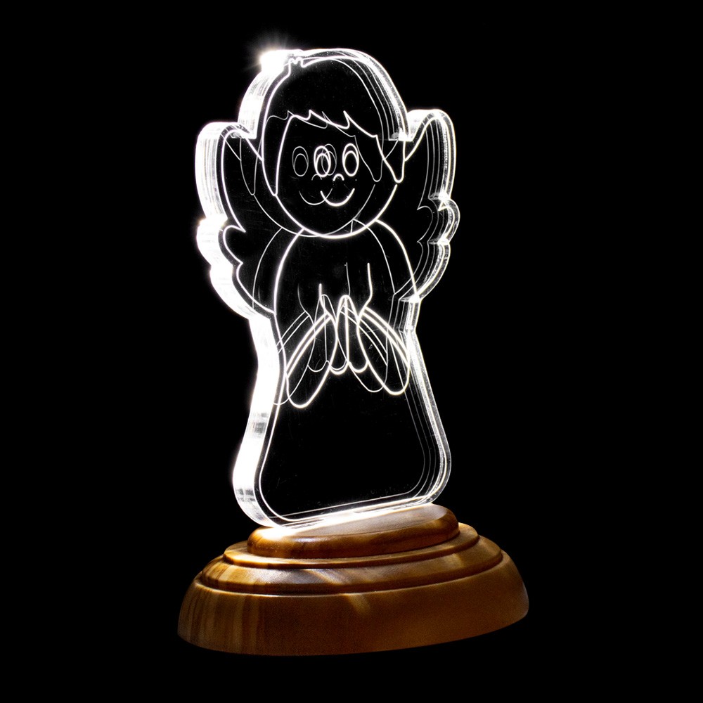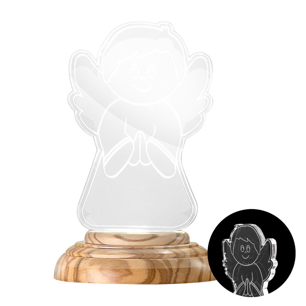 L'angioletto è interamente in plexiglass, mentre la base è in legno di ulivo nazionale, su di essa è posizionata una piccola luce LED con interruttore che illumina la statua.