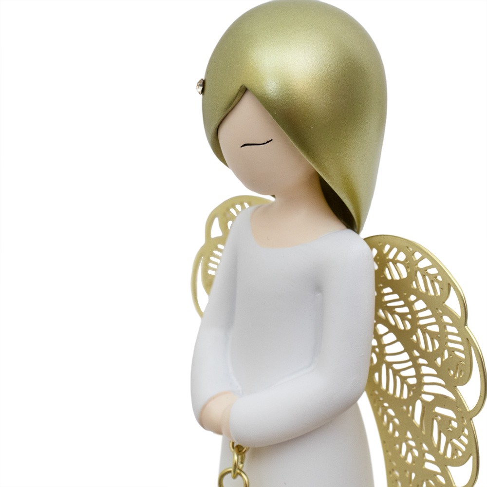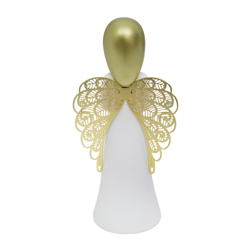 La statuetta si presenta con ali traforate e ciondolo cuore in metallo dorato, con graziosi punti luce tra i capelli.