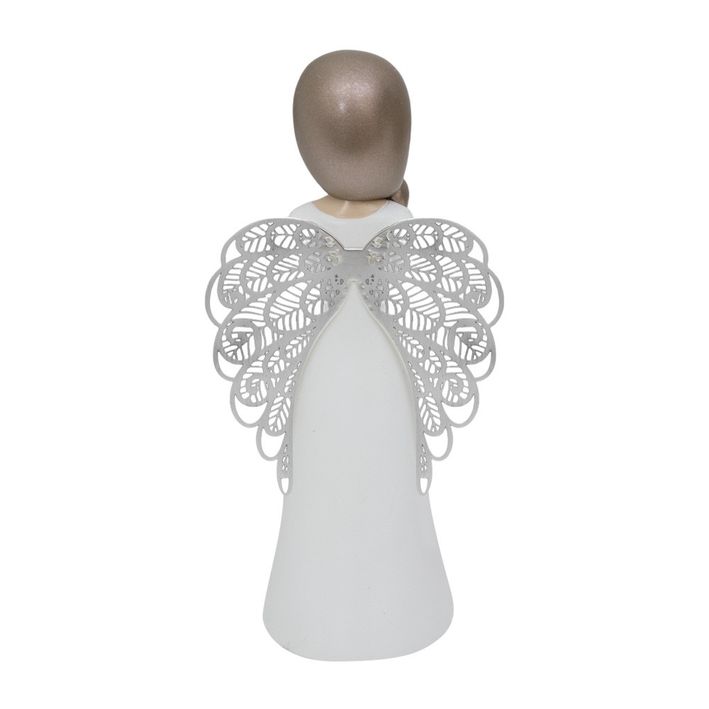 La statuetta si presenta con ali traforate e ciondolo cuore in metallo argento, con graziosi punti luce tra i capelli.