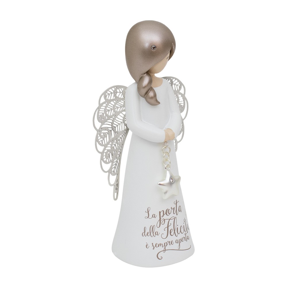 Un piccolo angelo stilizzato dal design moderno, decorato a mano, con frase dipinta " La porta della felicità è sempre aperta" - Collezione You Are An Angel.