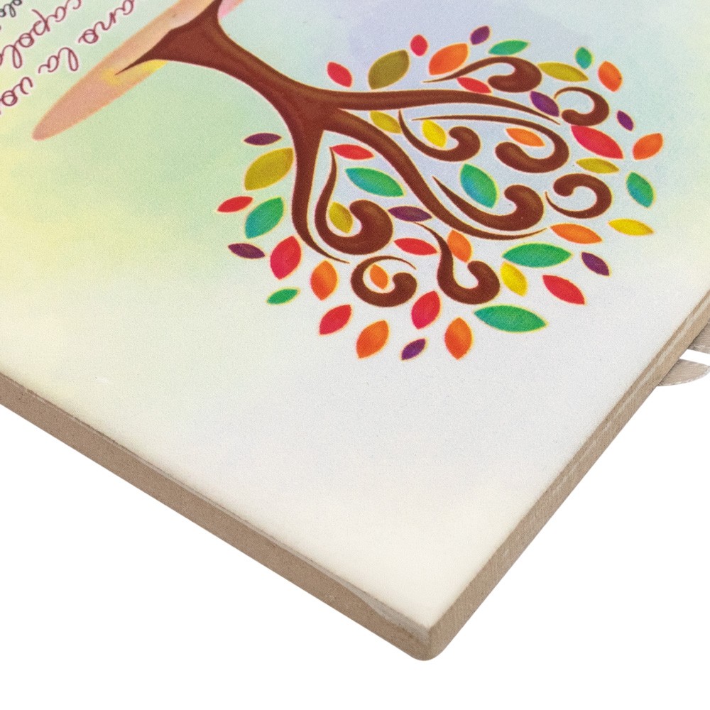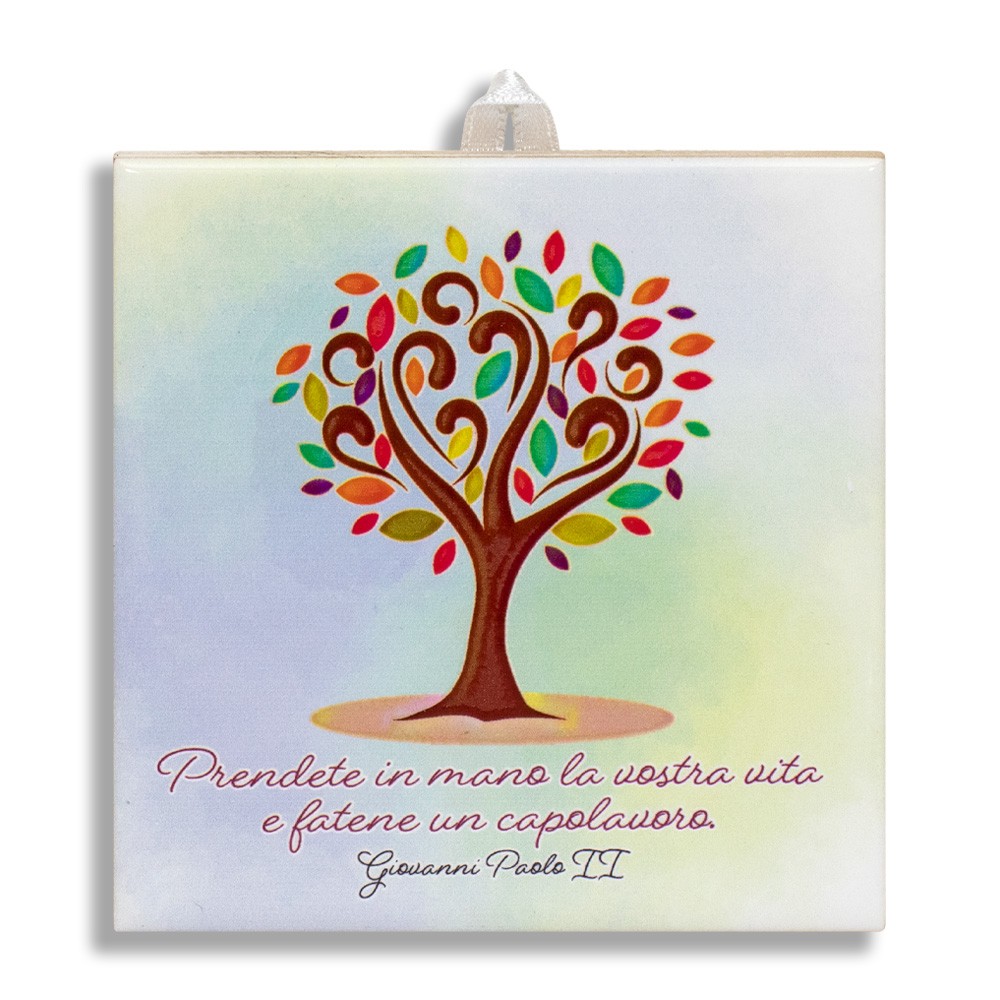 Il quadretto si presenta su fondo chiaro con immagine raffigurata dell'albero della vita e frase stampata: "Prendete in mano la nostra vita e fatene un capolavoro. Giovanni Paolo II ".