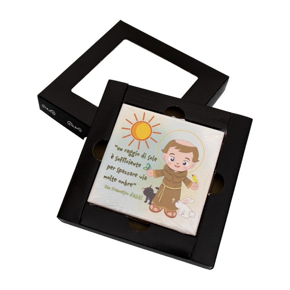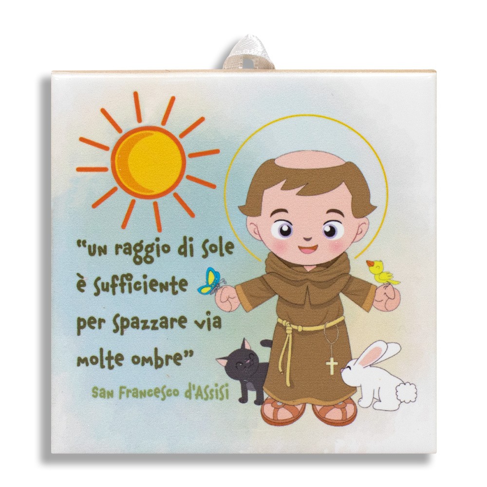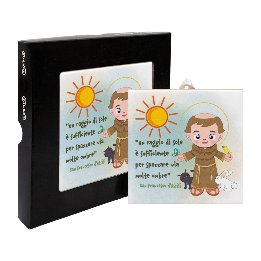 Il quadretto si presenta su fondo chiaro con immagine e frase di San Francesco d' Assisi: "Un raggio di sole è sufficiente per spazzare via molte ombre".