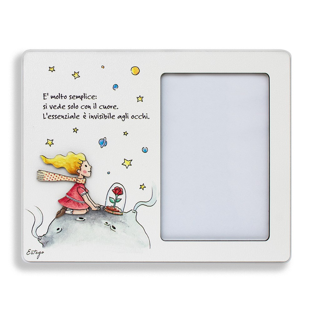 La cornice Piccolo Principe è realizzata in legno bianco con frase stampata "E' molto semplice: si vede solo con il cuore. L'essenziale è invisibile agli occhi" e applicazioni in rilievo tratte dal famoso libro del Piccolo Principe.