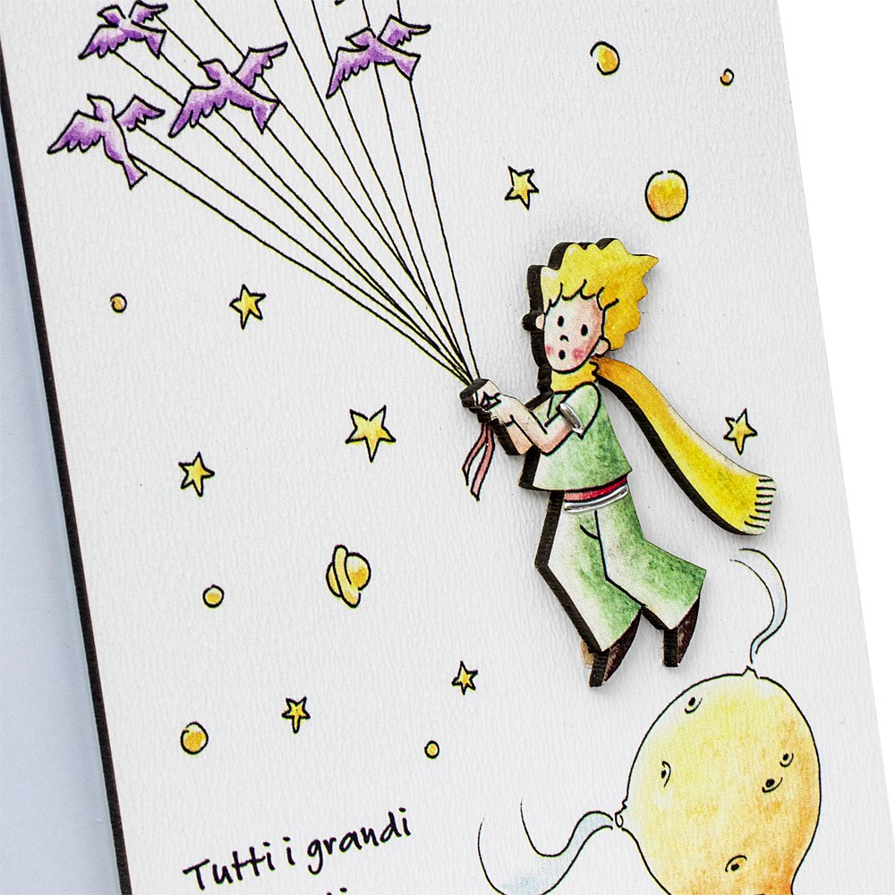 Realizzato in legno bianco con frase stampata "Tutti i grandi sono stati bambini una volta. Ma pochi di essi se ne ricordano" e arricchita con applicazioni in rilievo tratte dal famoso libro del Piccolo Principe.