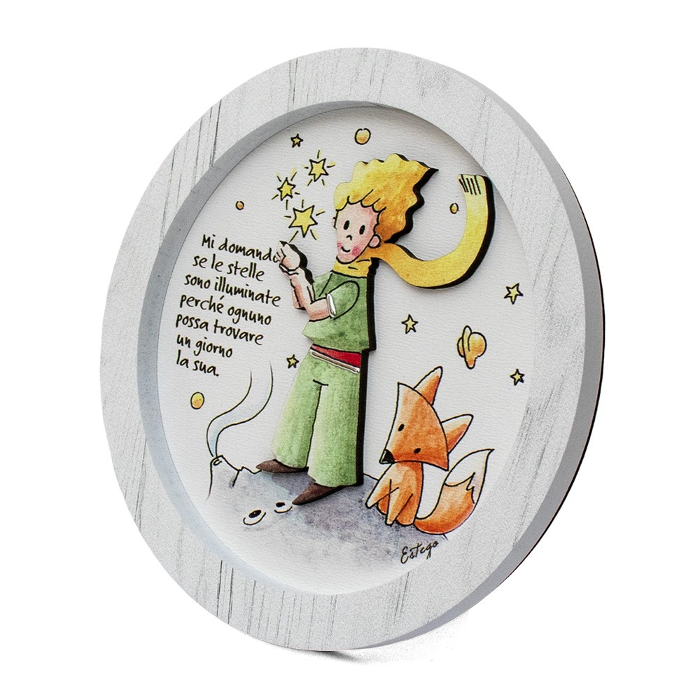 Il quadretto è interamente in legno, decorato a mano e arricchito con graziose applicazioni in rilievo del Piccolo Principe, può essere sia appeso (munito di foro) che da appoggio (completo di piedino in acciaio).