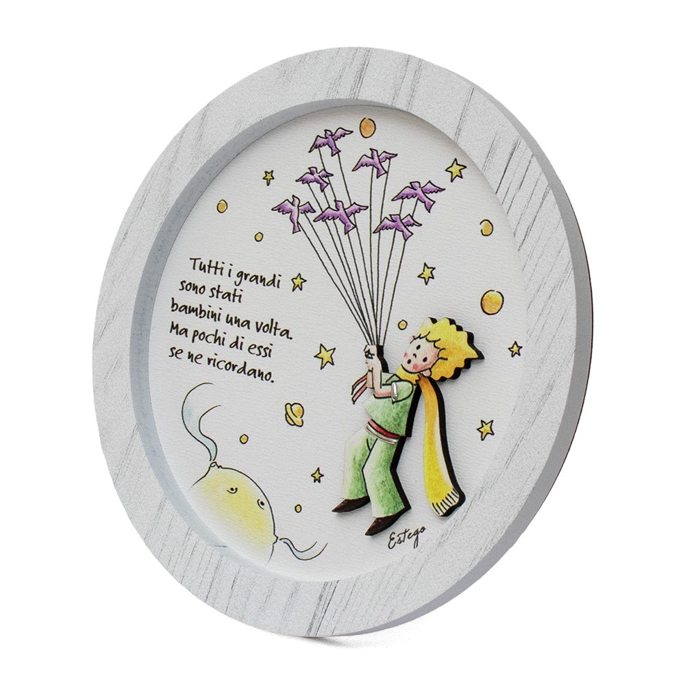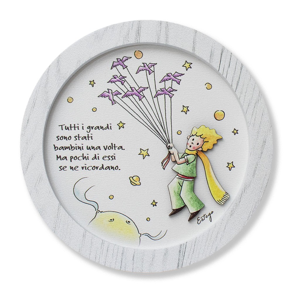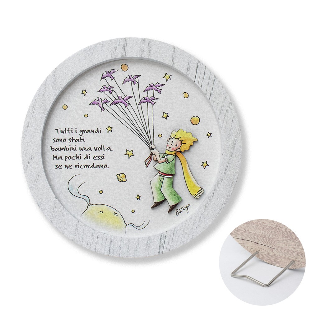 Quadretto tondo linea Piccolo Principe con frase stampata " Tutti i grandi sono stati bambini una volta. Ma pochi di essi se ne ricordano".