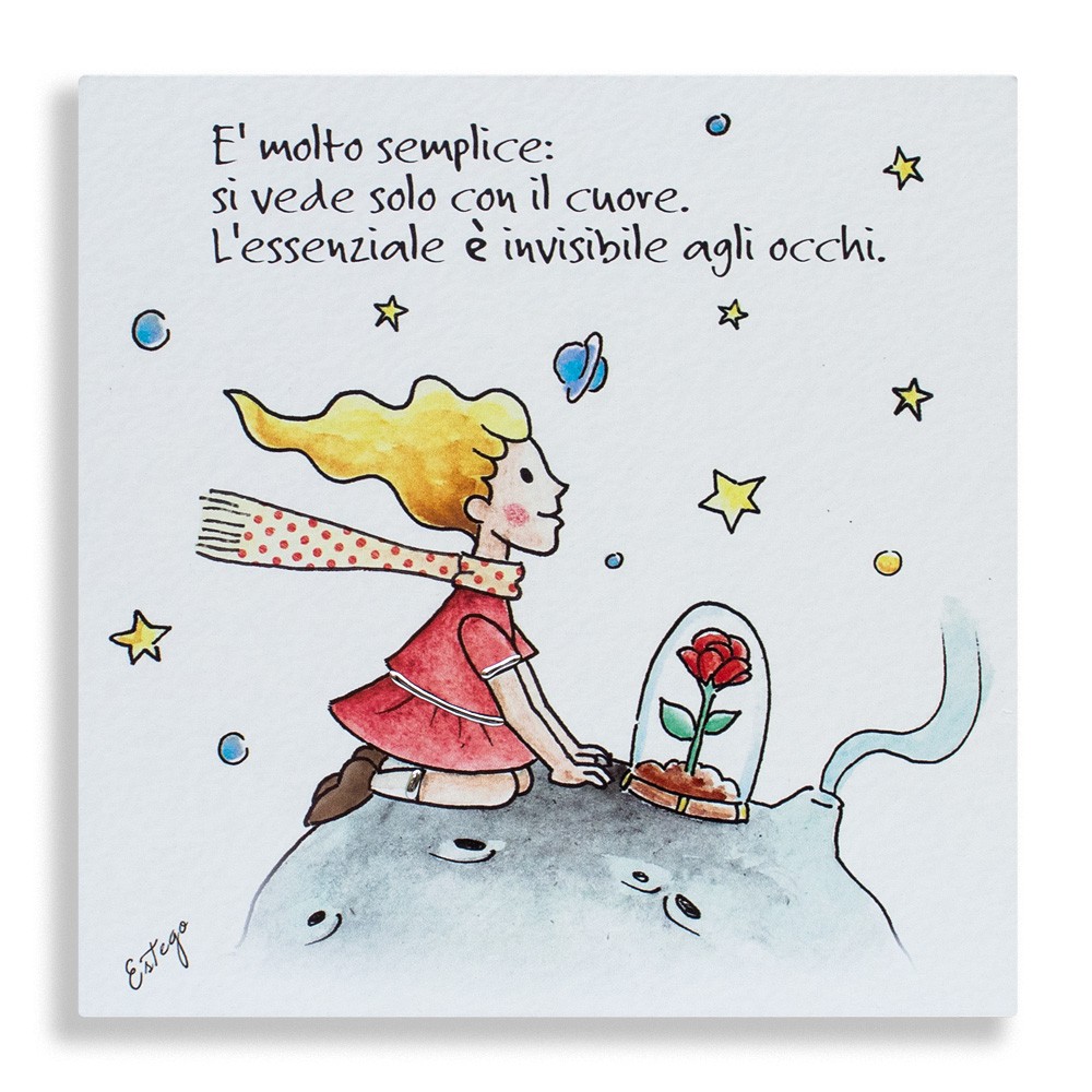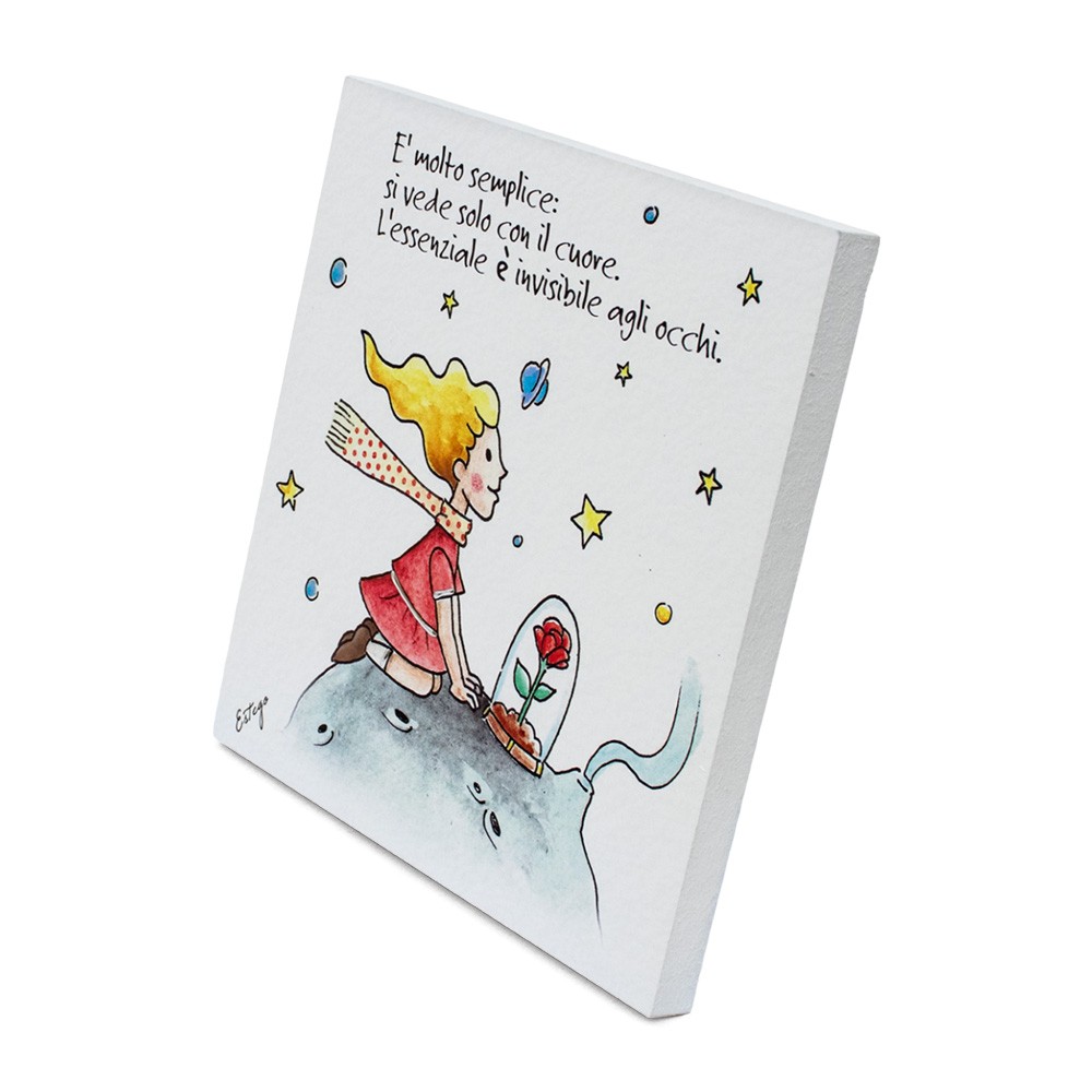 Il quadretto è realizzato in legno bianco, decorato a mano con frase stampata " E' molto semplice: si vede solo con il cuore. L'essenziale è invisibile agli occhi" tratte dal famoso libro del Piccolo Principe