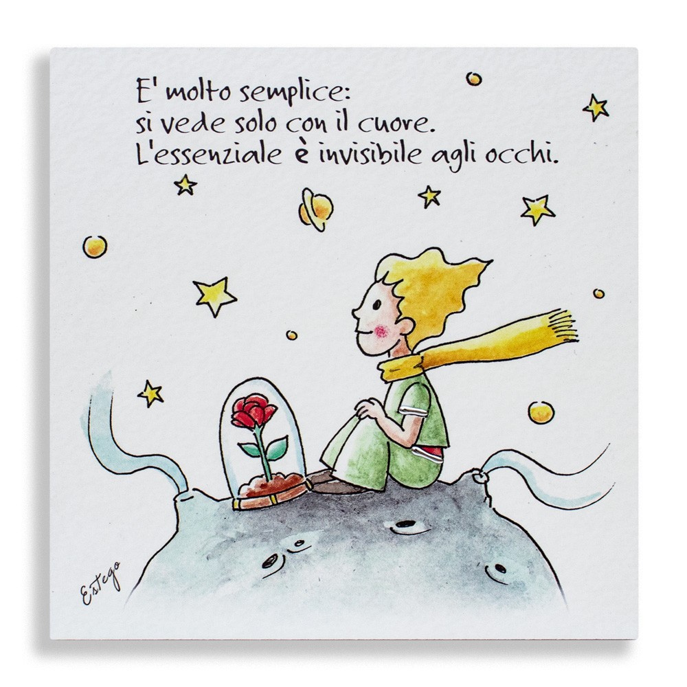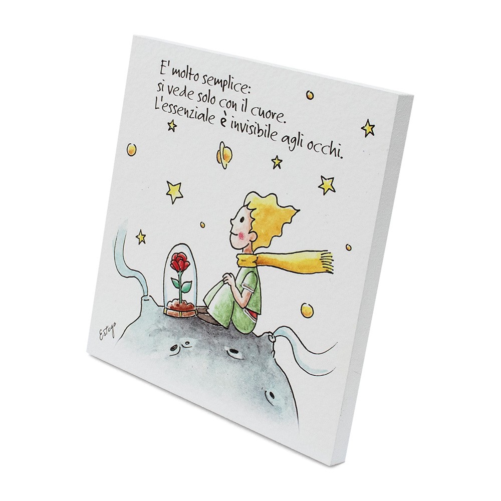 Realizzato in legno bianco, decorato a mano con frase stampata " E' molto semplice: si vede solo con il cuore. L'essenziale è invisibile agli occhi" tratte dal famoso libro del Piccolo Principe