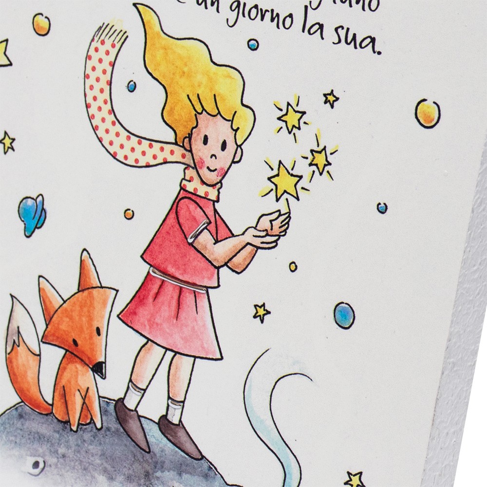 Meraviglioso quadretto (formato 20x20 cm) realizzato in legno bianco, decorato a mano con frase stampata " Mi domando se le stelle sono illuminate perché ognuno possa trovare un giorno la sua".