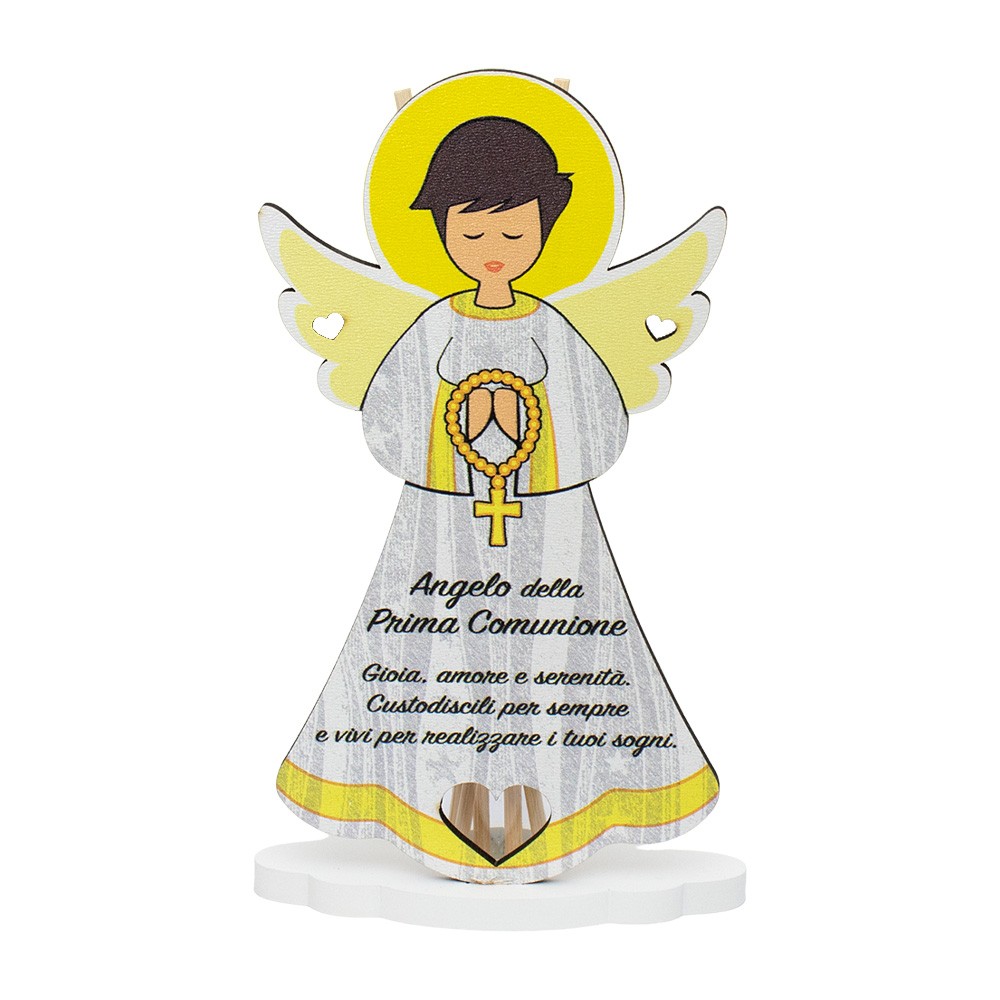 Bomboniera Prima Comunione con provetta e angioletto sagomato in legno MDF decorato.